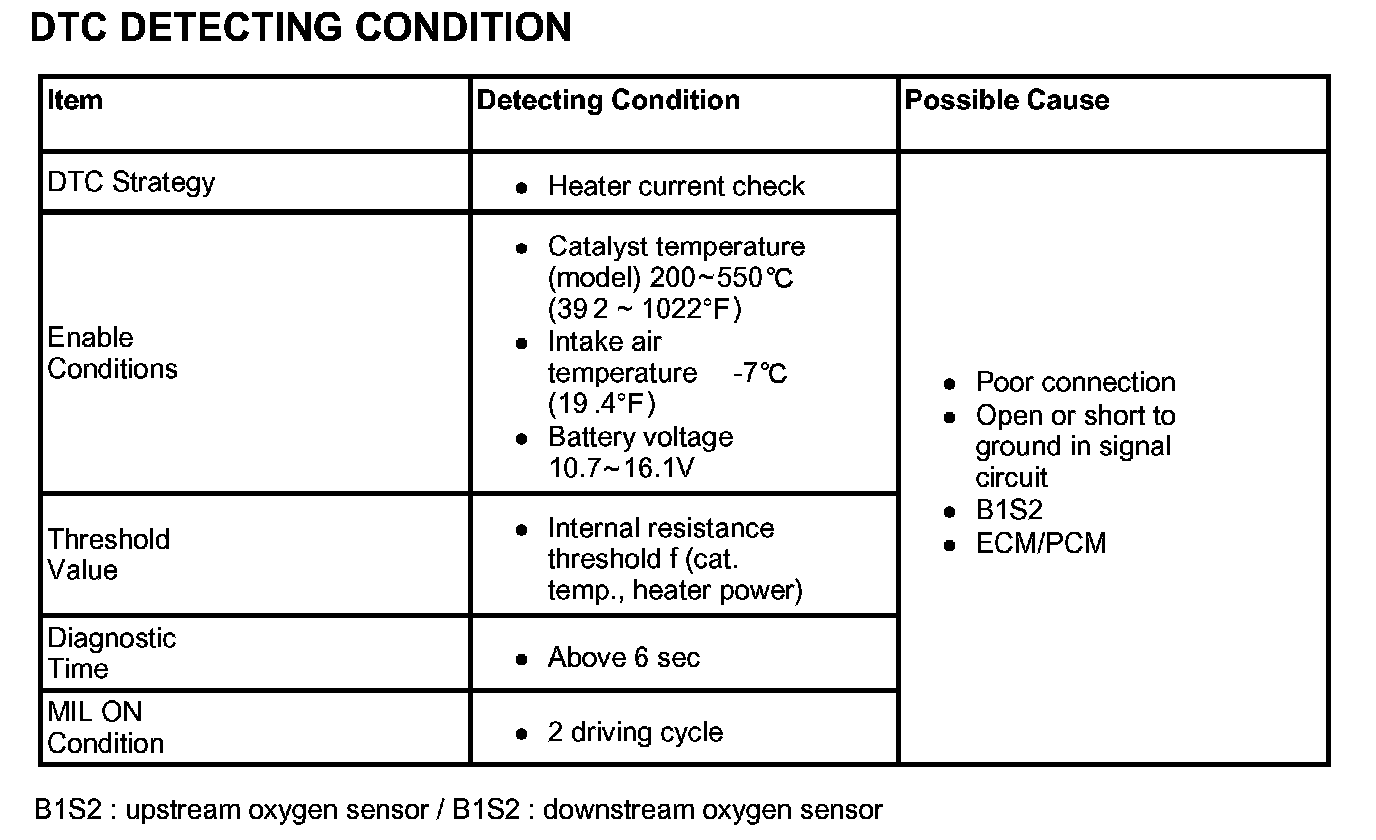If the internal resistance of heater is over the threshold value under enable conditions ECM/PCM sets DTC