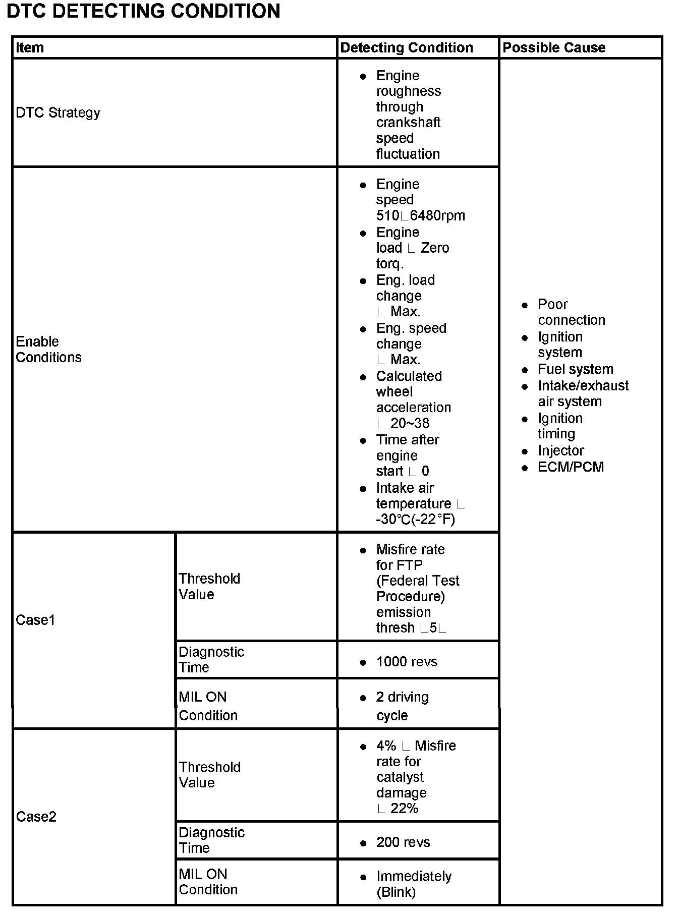 Misfires can be caused by lack of combustion in a cylinder due to absence of spark, poor fuel metering, poor compression, or many other causes. Even a small number of misfires may result in excessive exhaust emissions due to the unburned mixture. Increased misfire rates cause damage to the catalytic converter. The ECM/PCM monitors the crankshaft speed variation to determine if any misfiring generated. The ECM/PCM identifies the specific cylinder in which the misfire has occurred and counts individual misfire events by monitoring changes in the crankshaft rotation for each cylinder. A random misfire indicates one or more cylinders are misfiring.