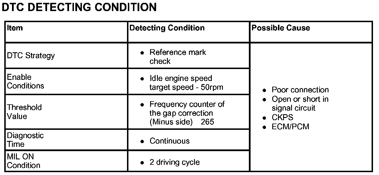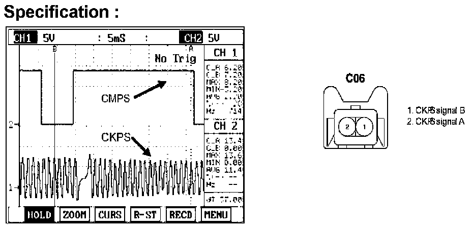 A Crankshaft Position Sensor (CKPS) is a magnetic type sensor that generates voltage using a sensor and a target wheel mounted on the crankshaft; there are 58 slot in the target wheel where one is longer than the others. When the slot in the wheel aligns with the sensor, the sensor voltage outputs low. When the metal (tooth) in the wheel aligns with the sensor, the sensor voltage outputs high. During one crankshaft rotation there are 58 rectangular signals and one longer signal. The ECM/PCM calculates engine RPM by using the sensor' s signal and controls the injection duration and the ignition timing. Using the signal differences caused by the longer slot, the ECM/PCM identifies which cylinder is at top dead center.