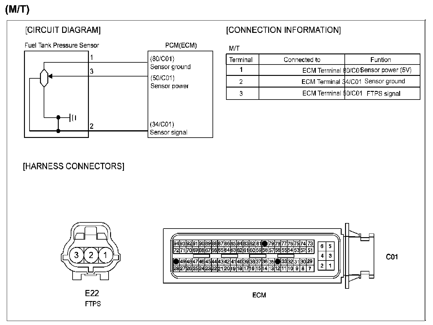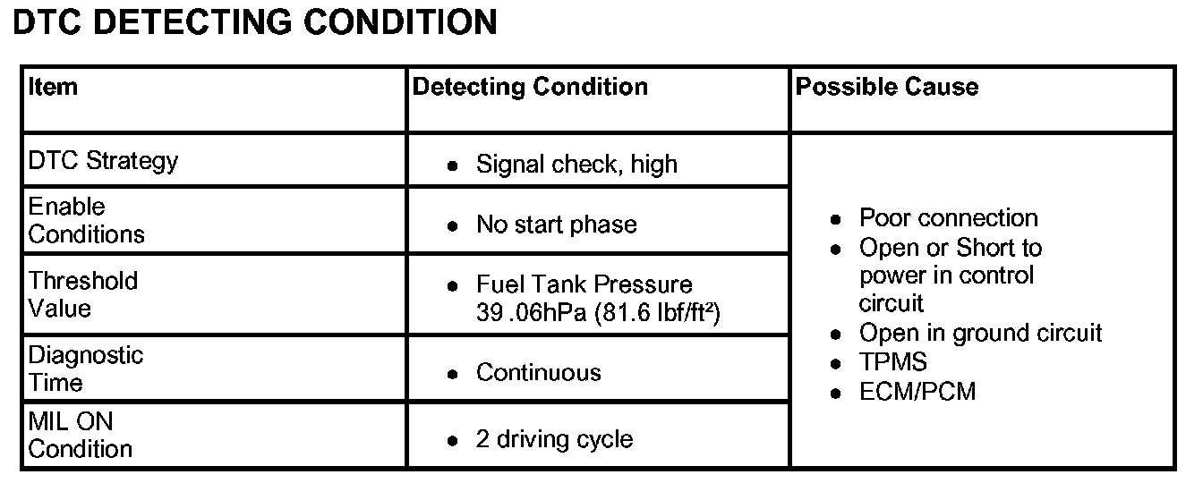 The evaporative emissions system prevents hydrocarbon (HC) vapors from the fuel tank from escaping into the atmosphere where they could form photochemical smog. The fuel tank pressure sensor is a component of the evaporative emission system.The Tank Pressure Sensor converts fuel tank pressure to a proportional analog voltage signal which is read by the engine controller for evaluation during execution of the Evaporative System Diagnostic. The Tank Pressure may be below atmospheric pressure (i.e.. a vacuum) or above atmospheric pressure.The fuel tank pressure is used to measure the difference between the air pressure (or vacuum) in the fuel tank and the ambient air pressure. ECM/PCM supplies a 5-volt reference and a ground to the sensor, which allows the sensor's output voltage to range from 0.1 to 4.9 volts.
