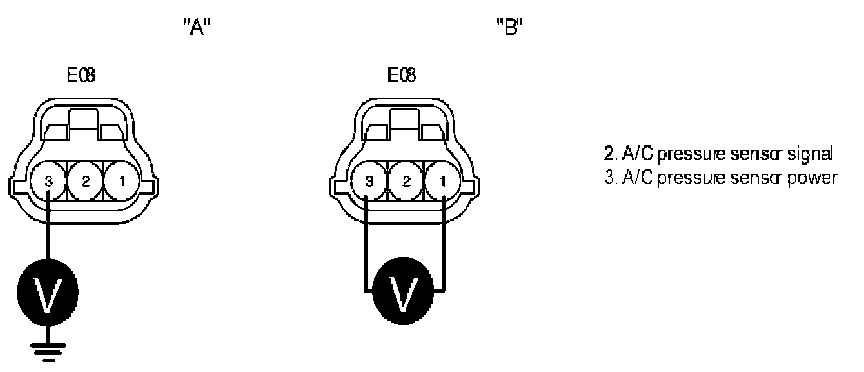 5. Measure the voltage between terminal 3 and terminal 1 of A/C pressure sensor harness connector. (Fig B)