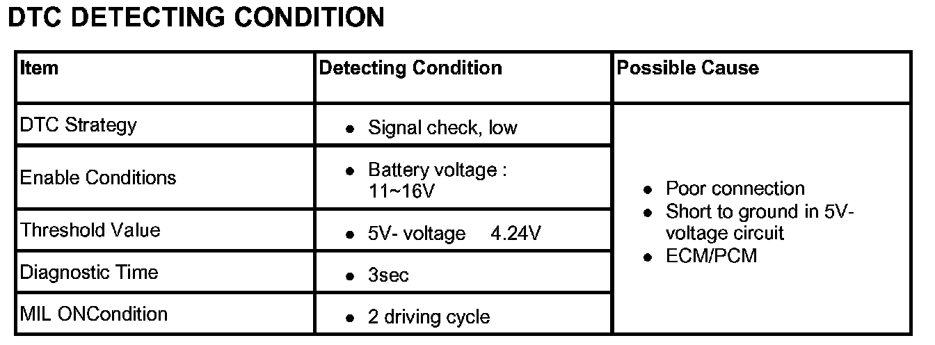 When ECM/PCM detects that the power for sensors(5 V) is below 4.24 V during 3 sec or more, ECM/PCM sets DTC P0642.