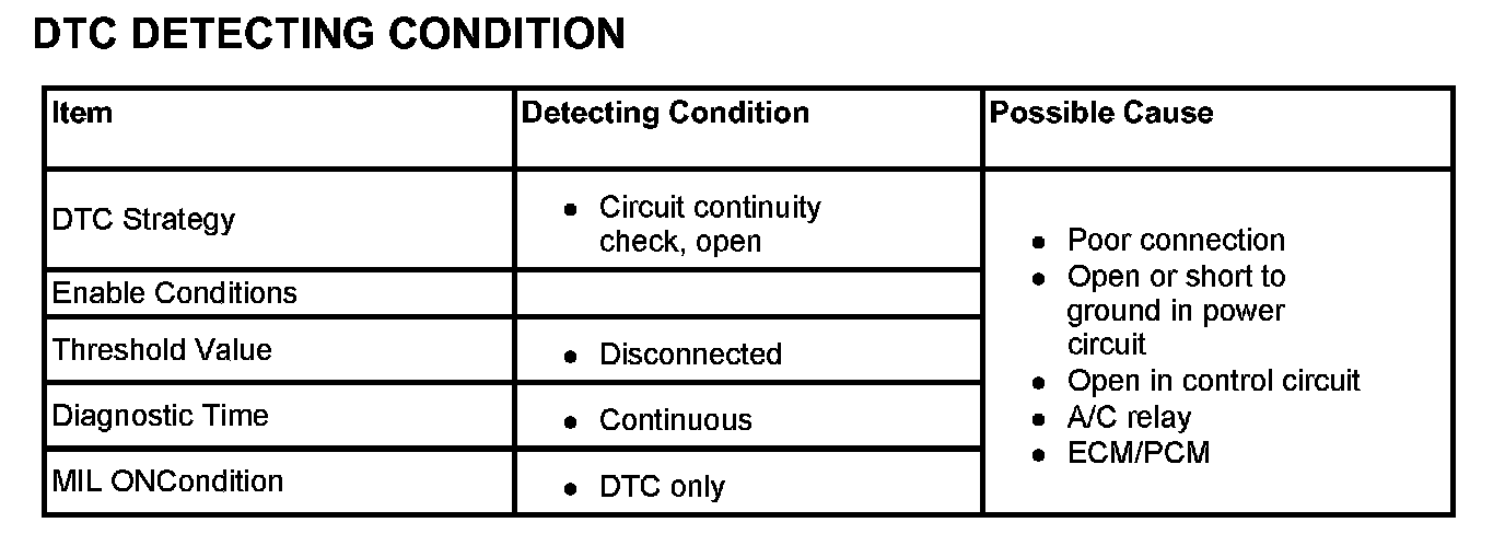 DTC P0645The A/C relay is activated if the A/C switch is ON while the blower is running and system operation is enabled the ECM/PCM. Power is then supplied to the A/C compressor electromagnetic clutch and A/C system is operated. The A/C compressor is switched out to prevent it running when full engine output is required or there is a risk of overheating.The ECM/PCM also inhibits compressor operation on starting to permit running conditions to stabilize.