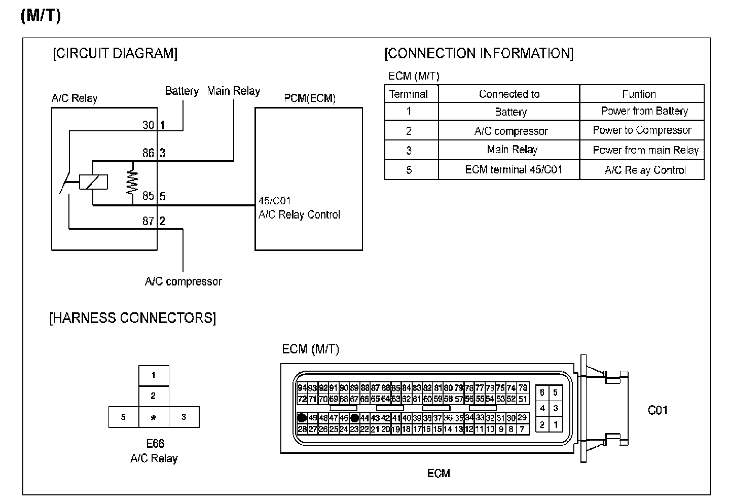 4. Measure the resistance between terminal 5 of A/C relay harness connector and terminal 38/C01-2of ECM/PCM harness connector.(AT) Measure the resistance between terminal 5 of A/C relay harness connector and terminal 45/C01of ECM/PCM harness connector.(MT)