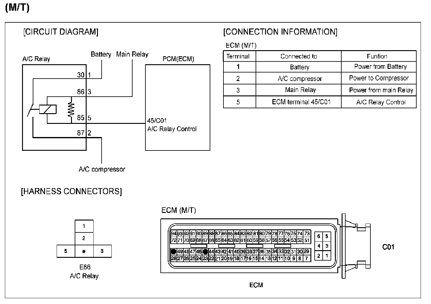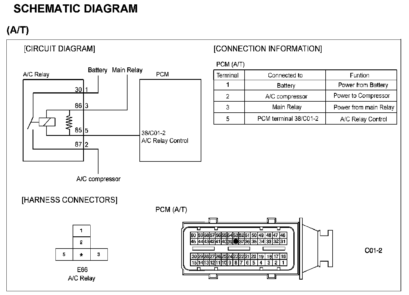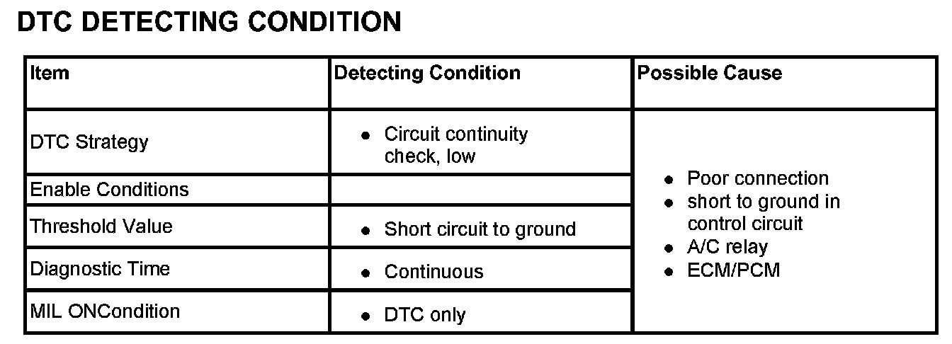 DTC P0646The A/C relay is activated if the A/C switch is ON while the blower is running and system operation is enabled the ECM/PCM. Power is then supplied to the A/C compressor electromagnetic clutch and A/C system is operated. The A/C compressor is switched out to prevent it running when full engine output is required or there is a risk of overheating.The ECM/PCM also inhibits compressor operation on starting to permit running conditions to stabilize.