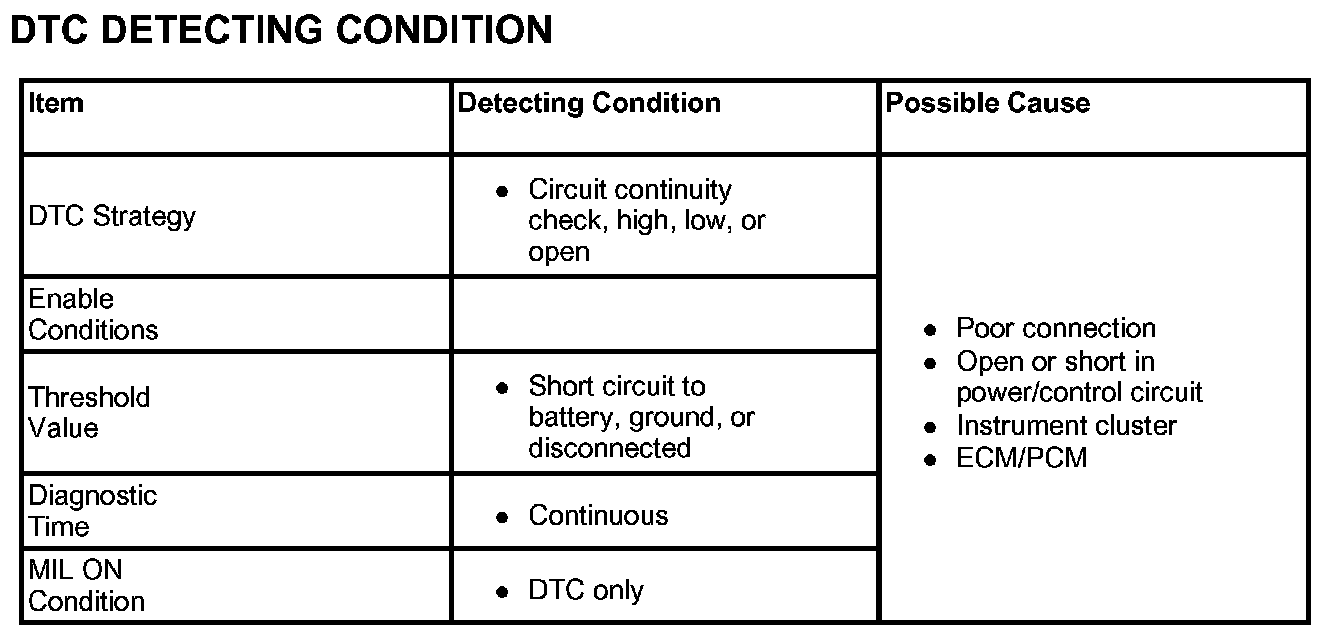 If there is Open, Short to ground or Short to power in MIL circuit, ECM/PCM sets DTC P0650.