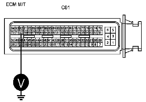 4. Measure the voltage between terminal 51/C01-2 of ECM/PCM harness connector and chassis ground. [A/T] Measure the voltage between terminal 70/C01 of ECM/PCM harness connector and chassis ground. [M/T]