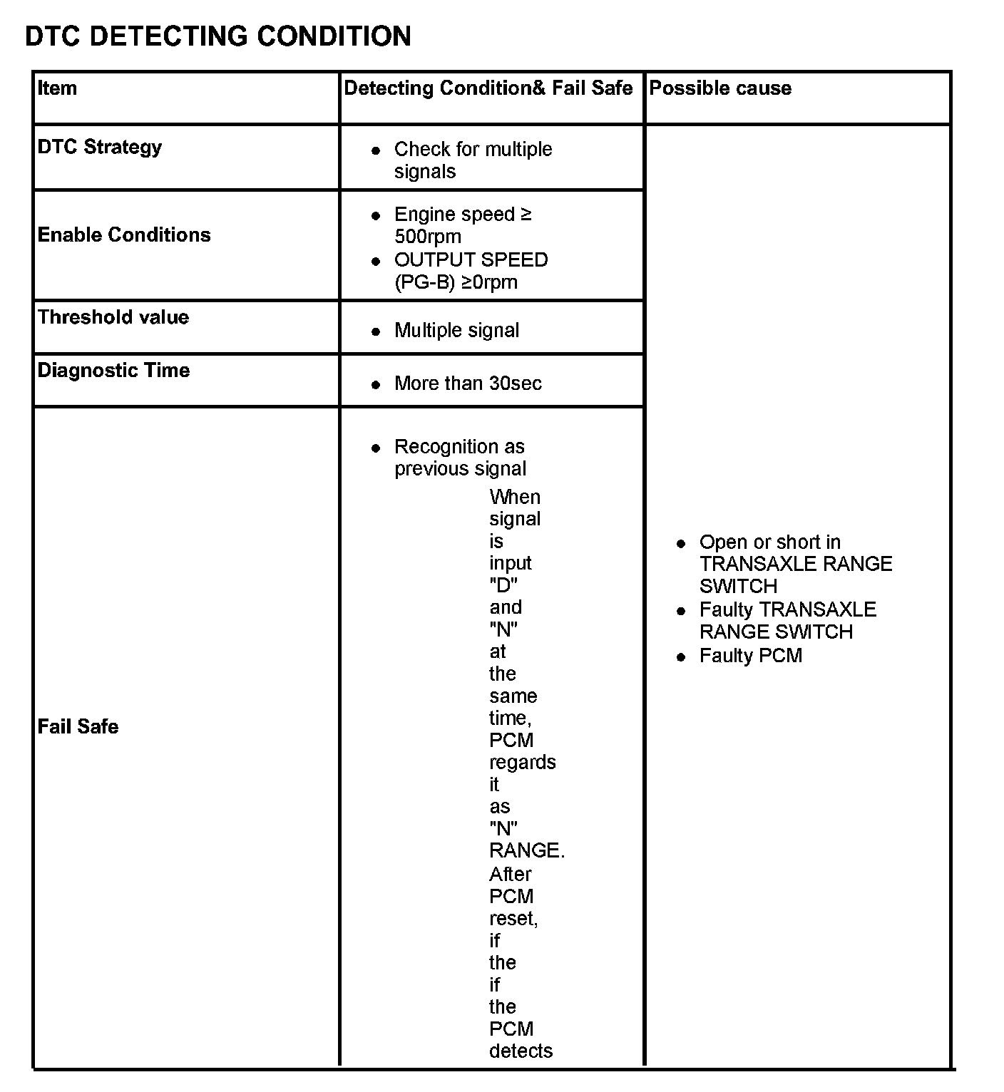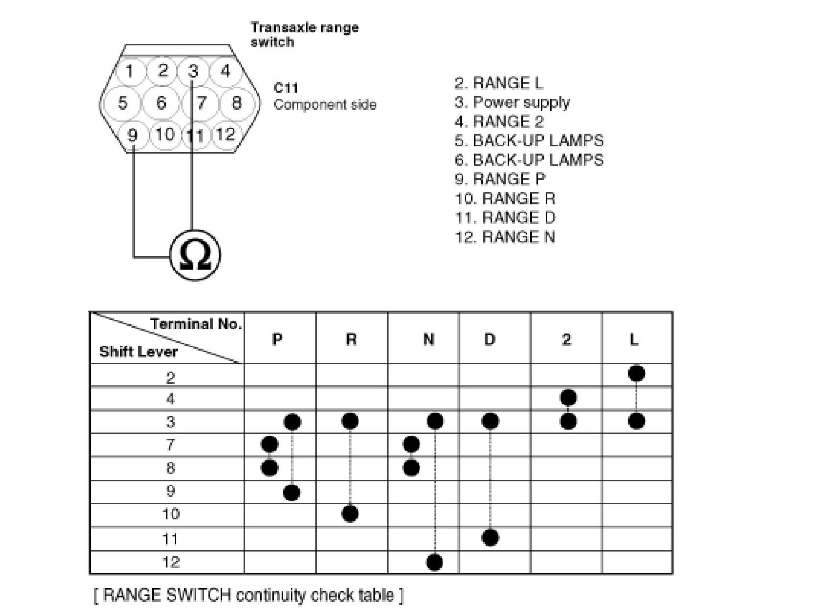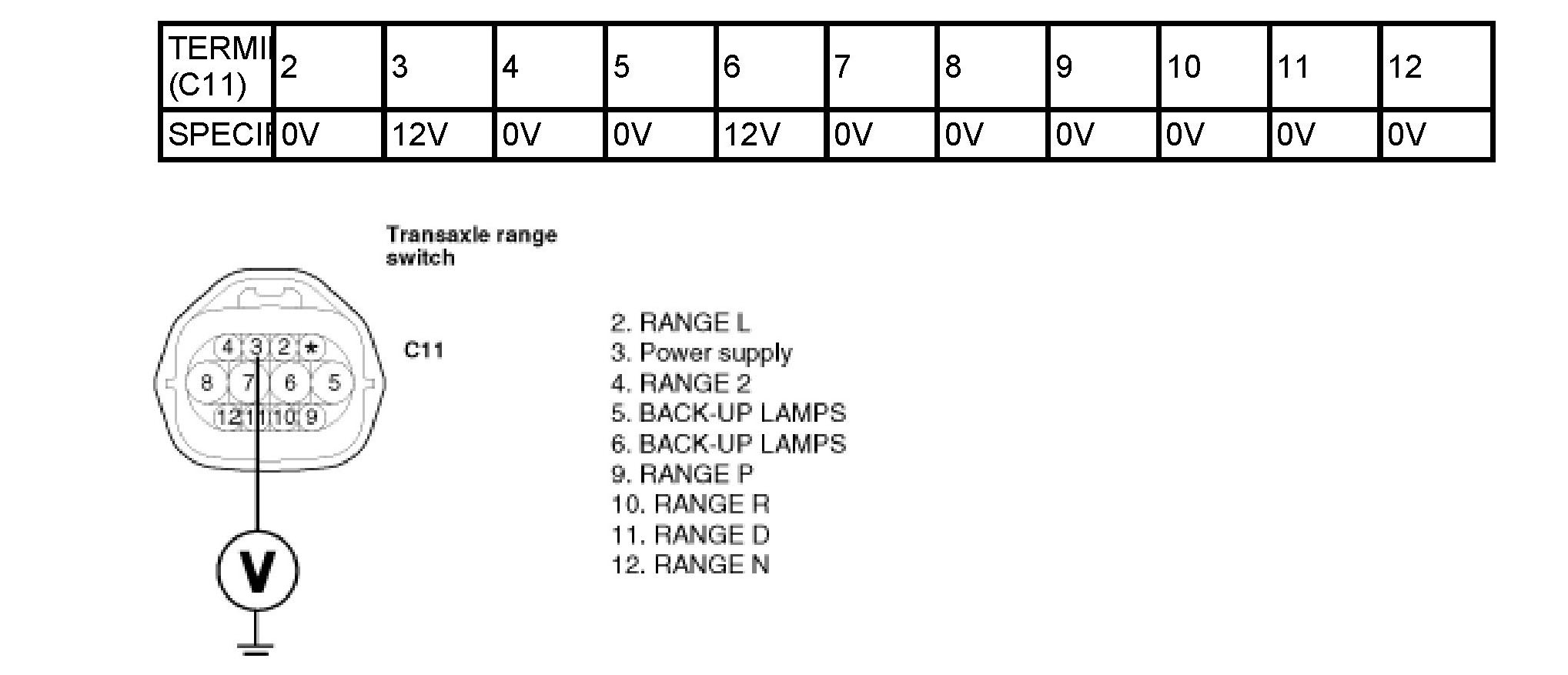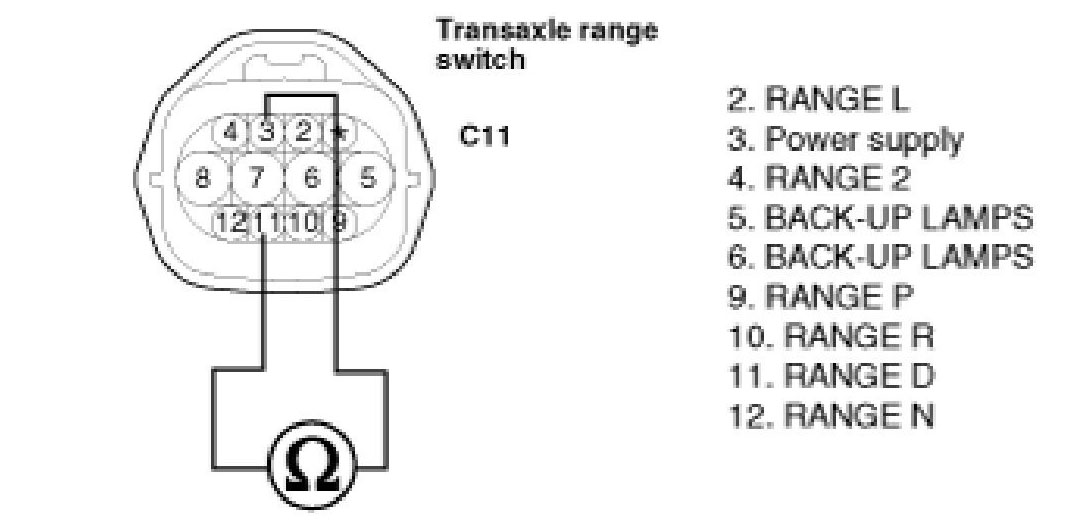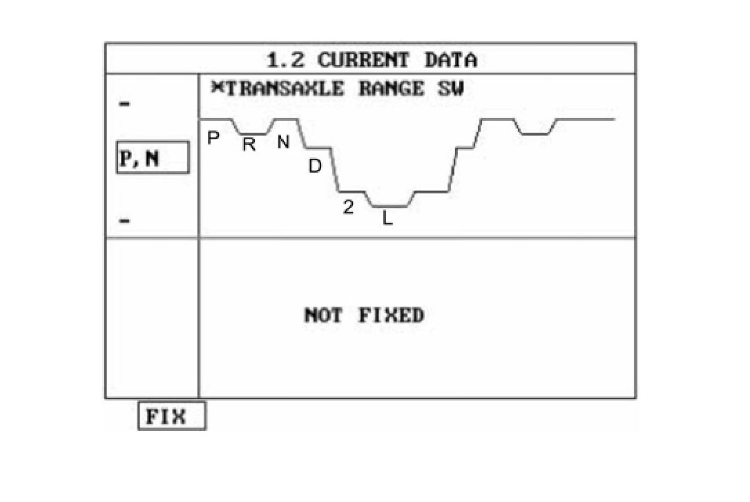 The Transaxle range switch sends the shift lever position information to the PCM using a 12V (battery voltage) signal. When the shift lever is in the D (Drive) position the output signal of transaxle range switch is 12V and in all other positions the voltage is 0V. The PCM judges the shift lever position by reading all signals, for the transaxle range switch, simultaneously.