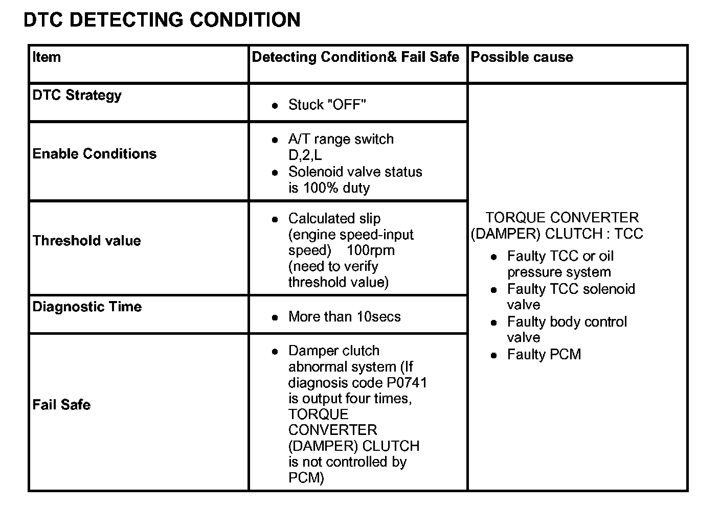 The PCM increases the duty ratio to engage the Damper Clutch by monitoring slip rpms (difference value between engine speed and turbine speed). To decrease the slip of the Damper Clutch, the PCM increases the duty ratio by applying more hydraulic pressure. When slip rpm does not drop under specification with 100% duty ratio, the PCM determines that the Torque Converter Clutch is stuck OFF and sets this code.