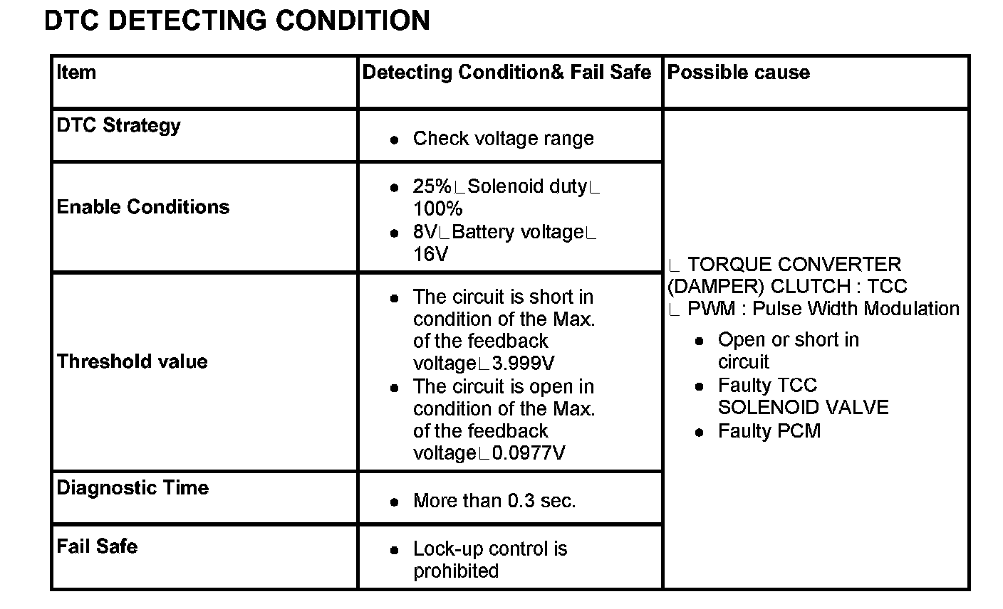 The PCM controls the locking and unlocking of the Torque Converter Clutch ( or Damper Clutch ), to the input shaft of the transmission, by applying hydraulic pressure. The main purpose of T/C clutch control is to save fuel by decreasing the hydraulic load inside the T/C. The PCM outputs duty pulses to control the Damper Clutch Control Solenoid Valve (DCCSV) and hydraulic pressure is applied to the DC according to the DCC duty ratio value. When the duty ratio is high, high pressure is applied and the Damper Clutch is locked. The normal operating range of the Damper Clutch Control duty ratio value is from 30% (unlocked) to 85% (locked).