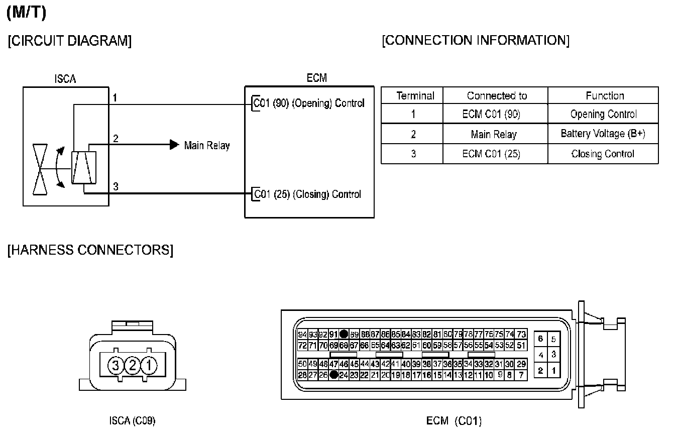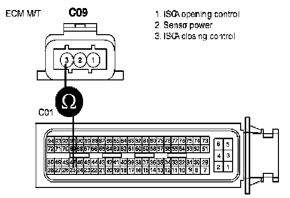 c. Measure the resistance between terminal 3 of ISCA harness connector and terminal 22/C01-2 of ECM/PCM harness connector. [A/T]Measure the resistance between terminal 3 of ISCA harness connector and terminal 25/C01 of ECM/PCM harness connector. [M/T]