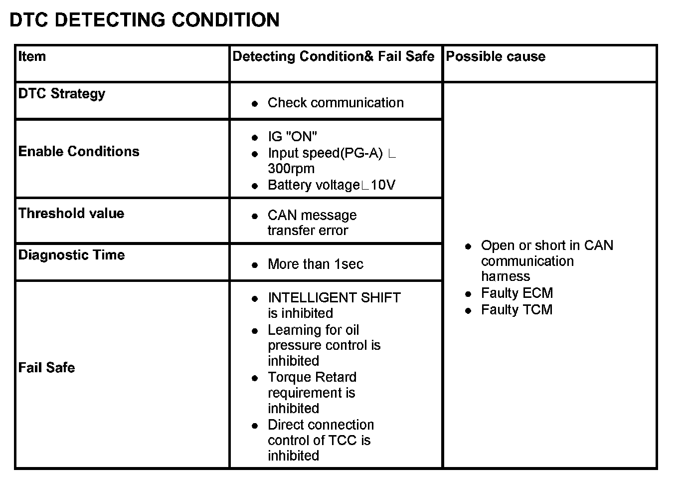 When the TCM cannot read the data from the ECM through the CAN-BUS line, the TCM sets this code. CAN-BUS circuit malfunctioning or ECM can be a possible cause of this DTC.