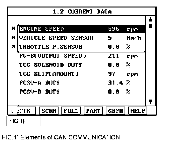 3. Monitor the "CAN COMMUNICATION SERVICE DATA (ENGINE RPM, VEHICLE SPEED SENSOR, THROTTLE P. SENSOR)" parameters on the Scantool.