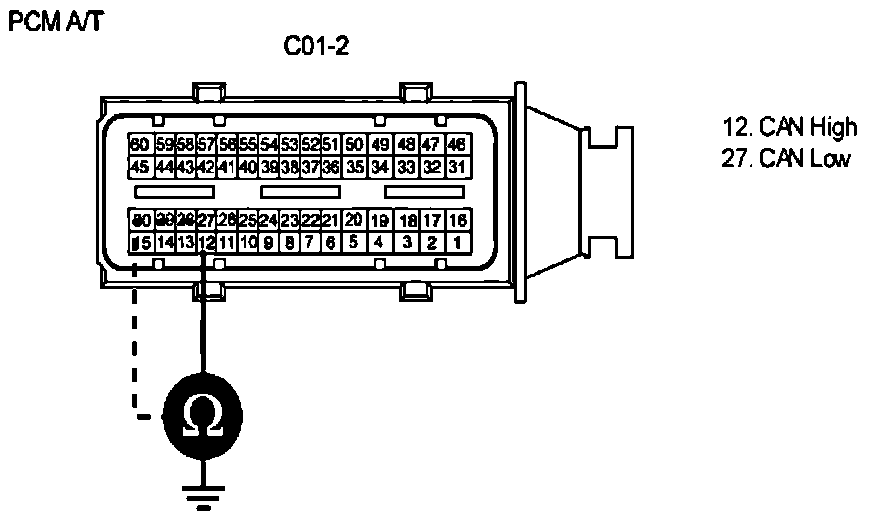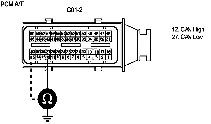 c. Measure the resistance between terminal 12 and 27 of ECM/PCM connector. (C01-2) (Component side)Measure the resistance between terminal 84 and 62 of ECM/PCM connector. (C01) (Component side)