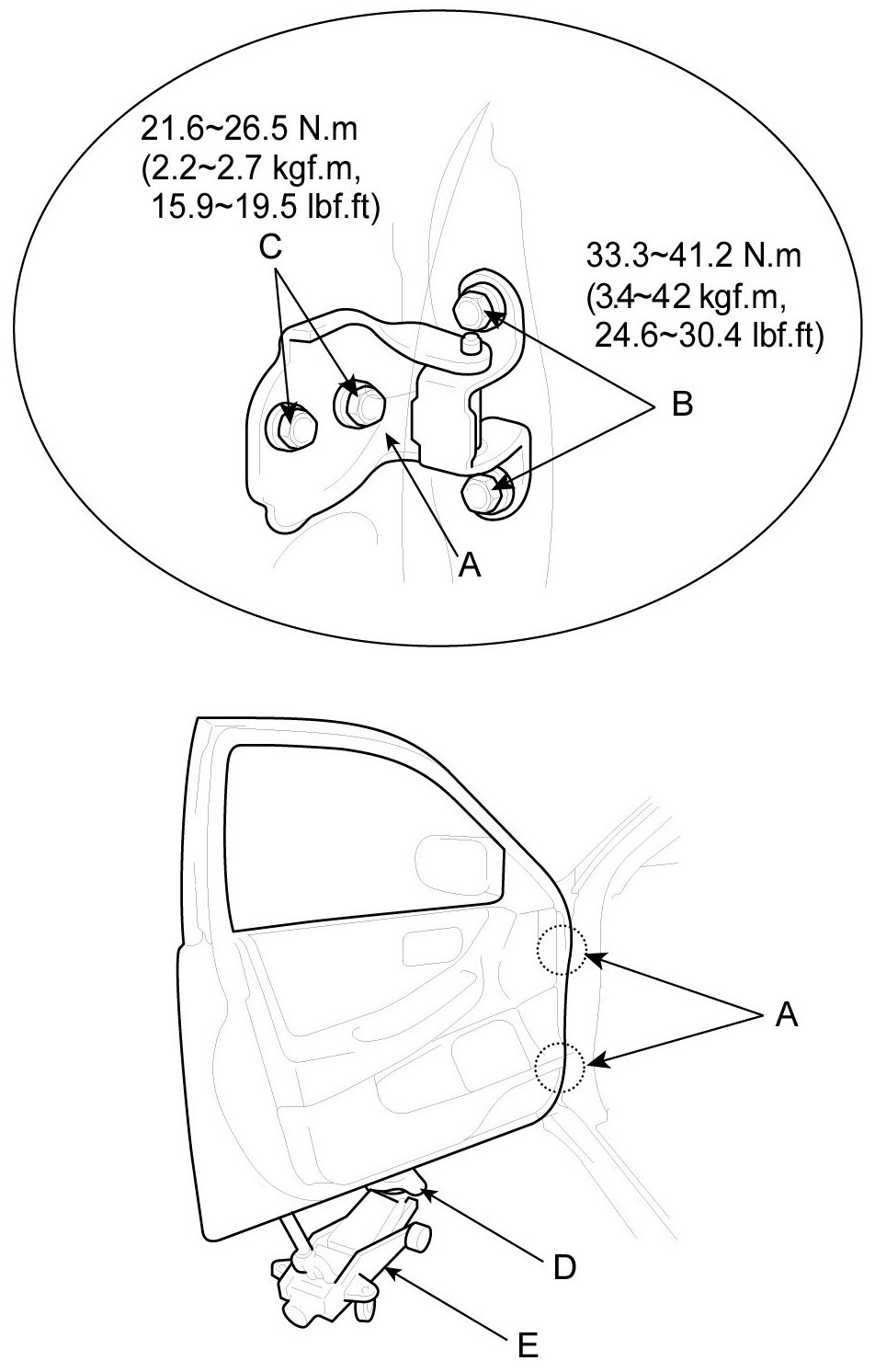 - Place a shop towel (D) on the jack (E) to prevent damage to the door when adjusting the door.