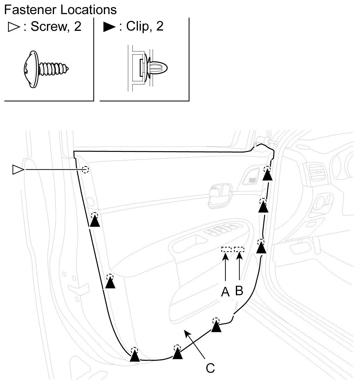 3. Loosen the door trim mounting screws. Disconnect the power window switch connector (A), power mirror connector (B). Remove the door trim (C).