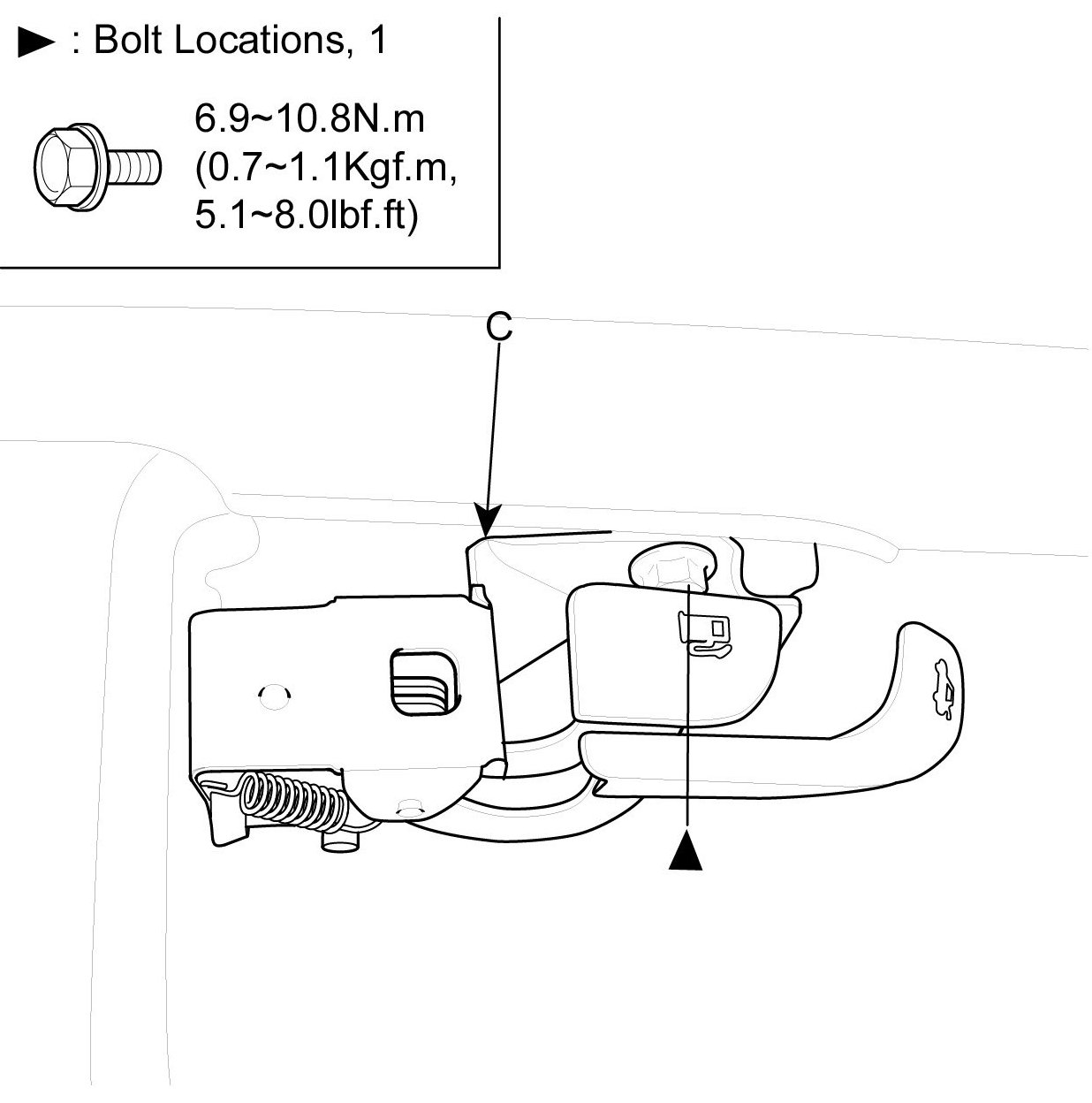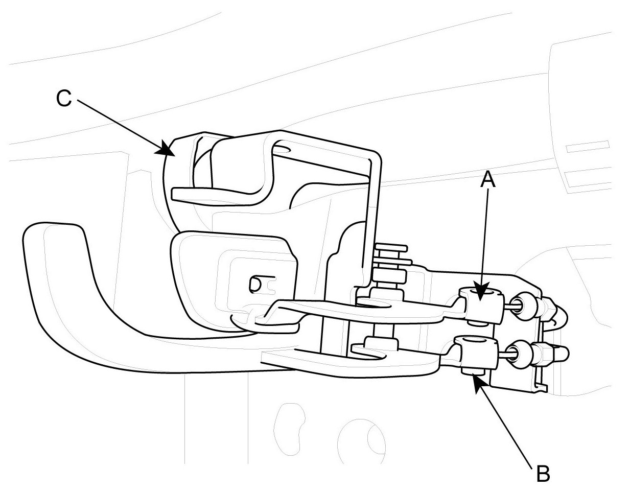 3. Disconnect the release handle cable (A) and fuel fill door release handle cable (B) then remove the release handle (C).