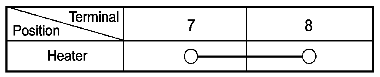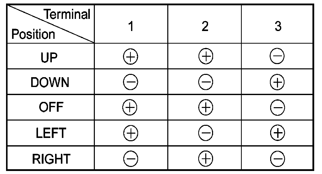 4. Apply battery voltage to each terminal as shown in the table and verify that the mirror operates properly.