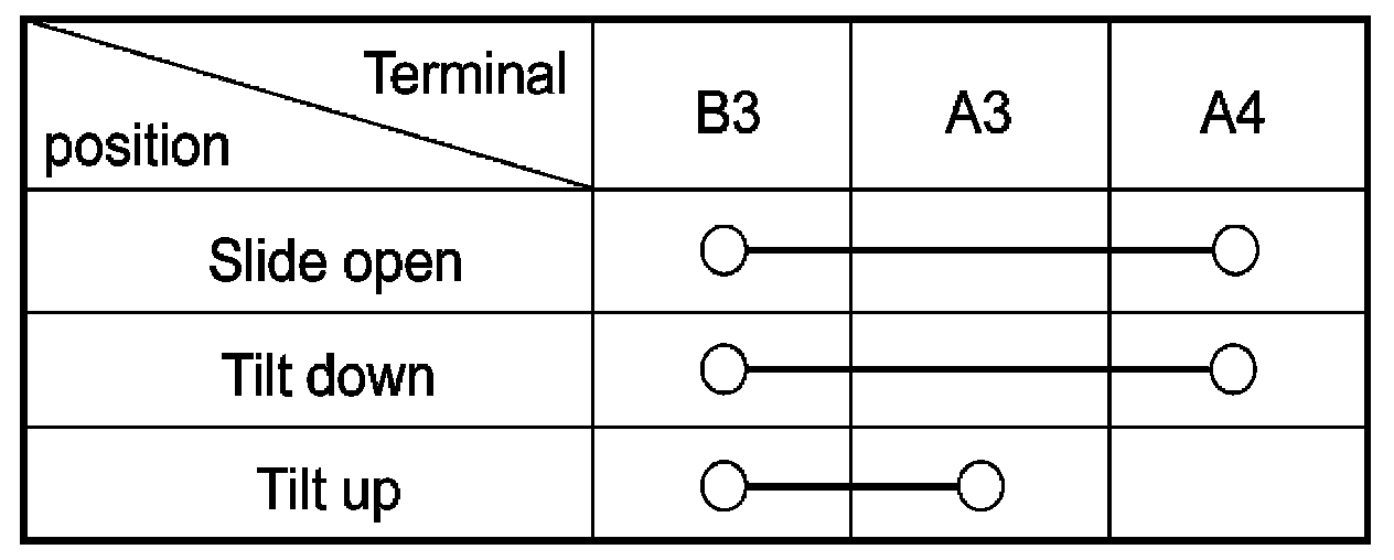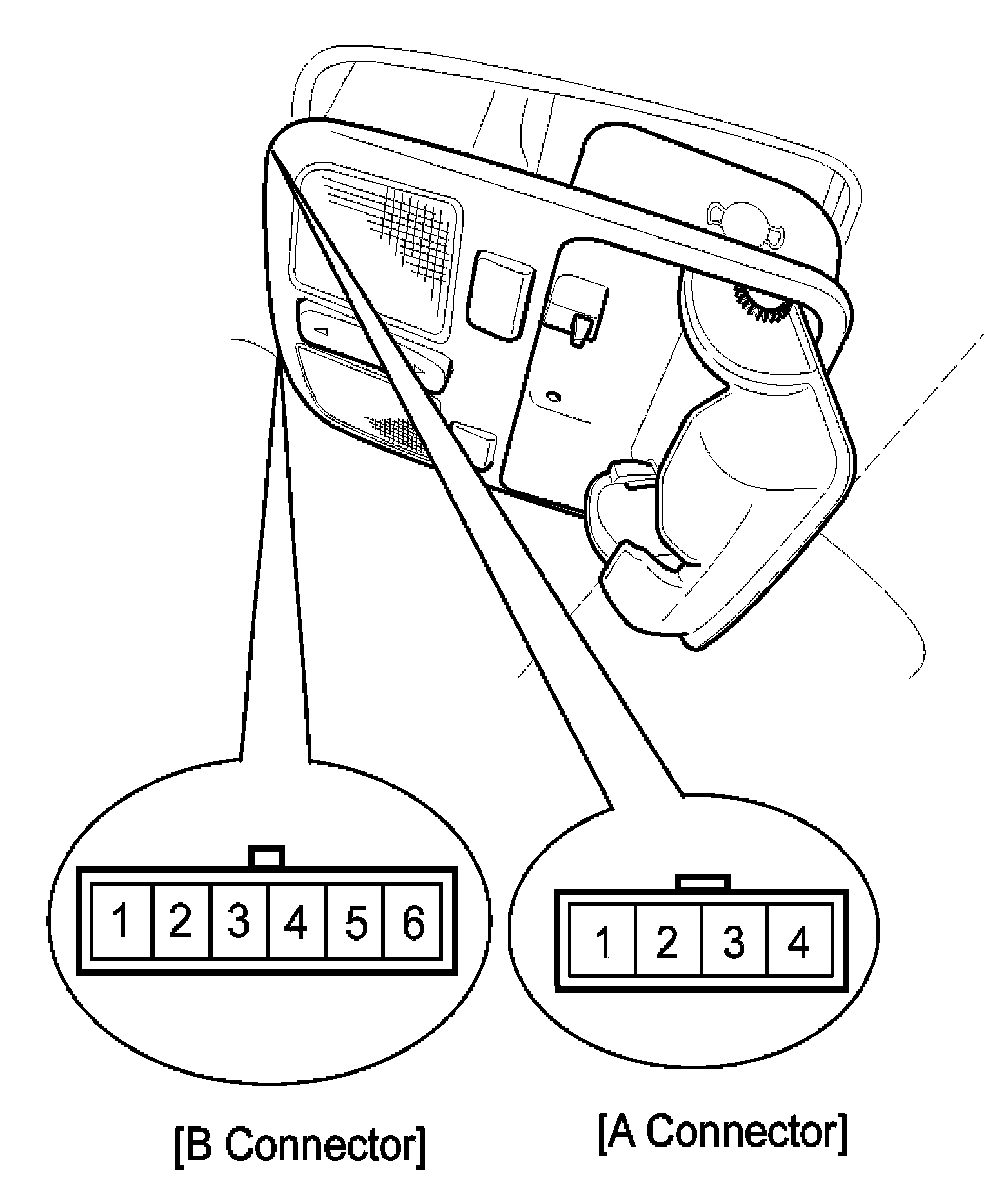 3. Disconnect the connector then remove the overhead console lamp assembly from the headliner. Check for continuity between the terminals. If the continuity is not as specified, replace the sunroof switch.