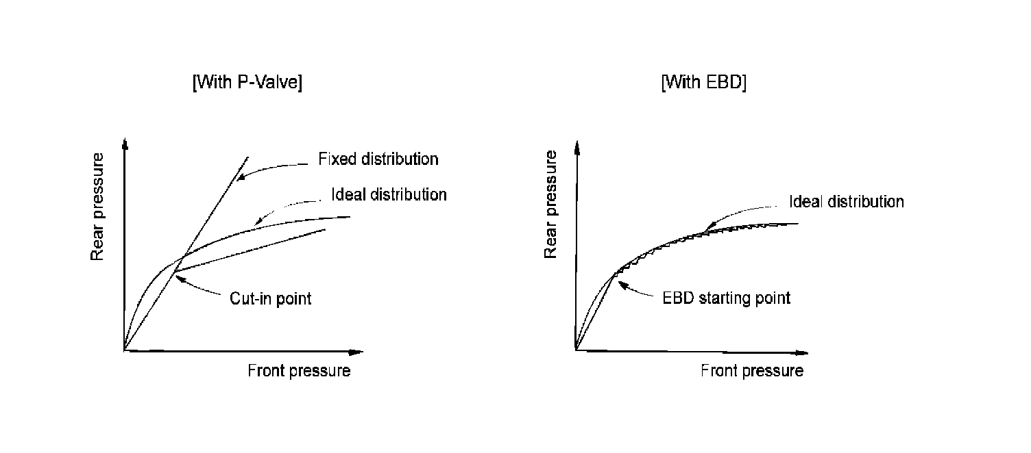 EBD (ELECTRONIC BRAKE-FORCE DISTRIBUTION) OPERATIONThe EBD system (Electronic Brake force Distribution) as a sub-system of the ABS system is to control the effective adhesion utilization by the rear wheels. It further utilizes the efficiency of highly developed ABS equipment by controlling the slip of the rear wheels in the partial braking range. The brake force is moved even closer to the optimum and controlled electronically, thus dispensing with the need for the proportioning valve. The proportioning valve, because of a mechanical device, has limitations to achieve an ideal brake force distribution to the rear wheels as well as to carry out the flexible brake force distribution proportioning to the vehicle load or weight increasing. And in the event of malfunctioning, driver cannot notice whether it fails or not. EBD controlled by the ABS Control Module, calculates the slip ratio of each wheel at all times and controls the brake pressure of the rear wheels not to exceed that of the front wheels. If the EBD fails, the EBD warning lamp (Parking brake lamp) lights up.