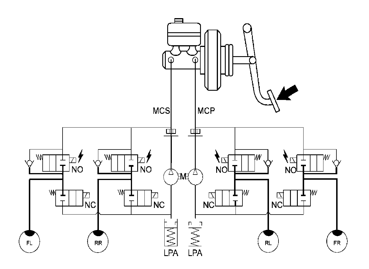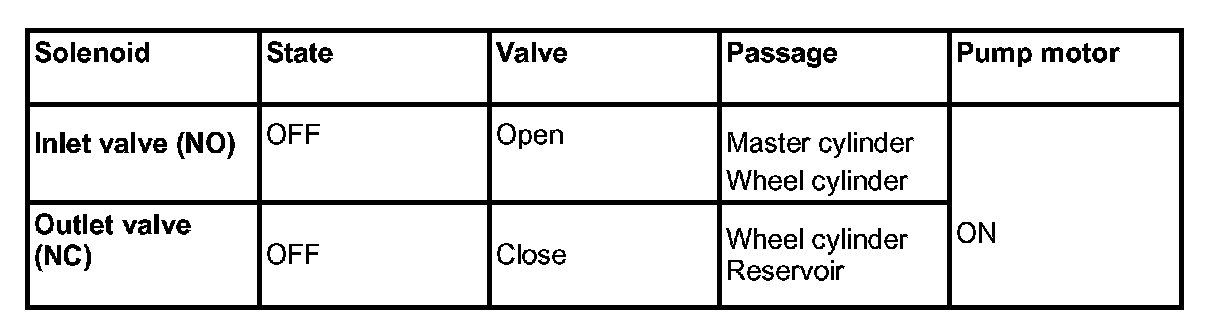 4. INCREASE MODE If HECU determines there's no lock-up in the wheel, HECU cuts voltage to solenoid valve. So voltage is not supplied to each solenoid valve, brake fluid passes through the inlet valve to wheel cylinder, resulting in pressure increase.