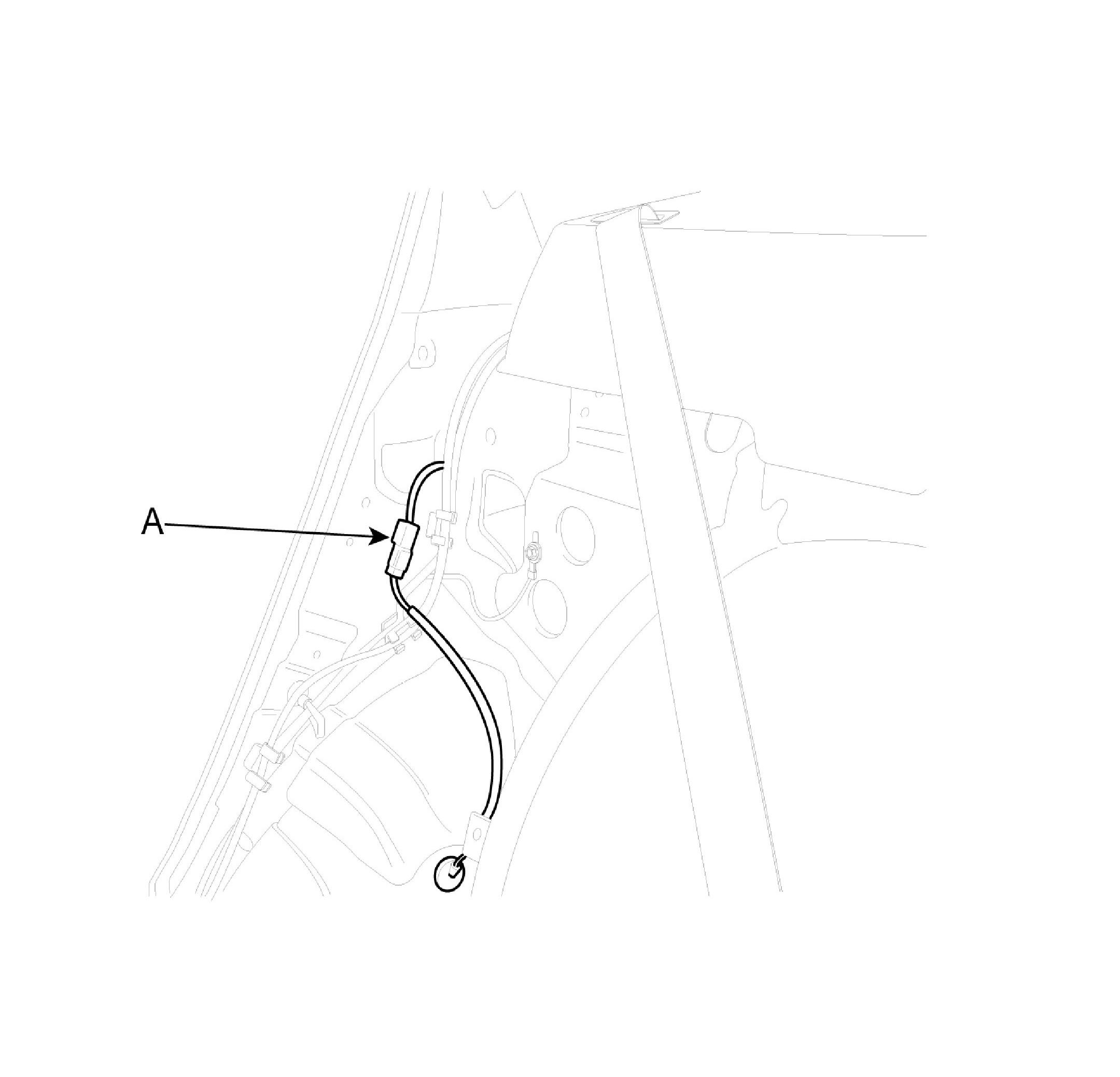 3. Remove the rear wheel speed house trim and rear pillar trim. Disconnect the rear wheel speed sensor connector (A).