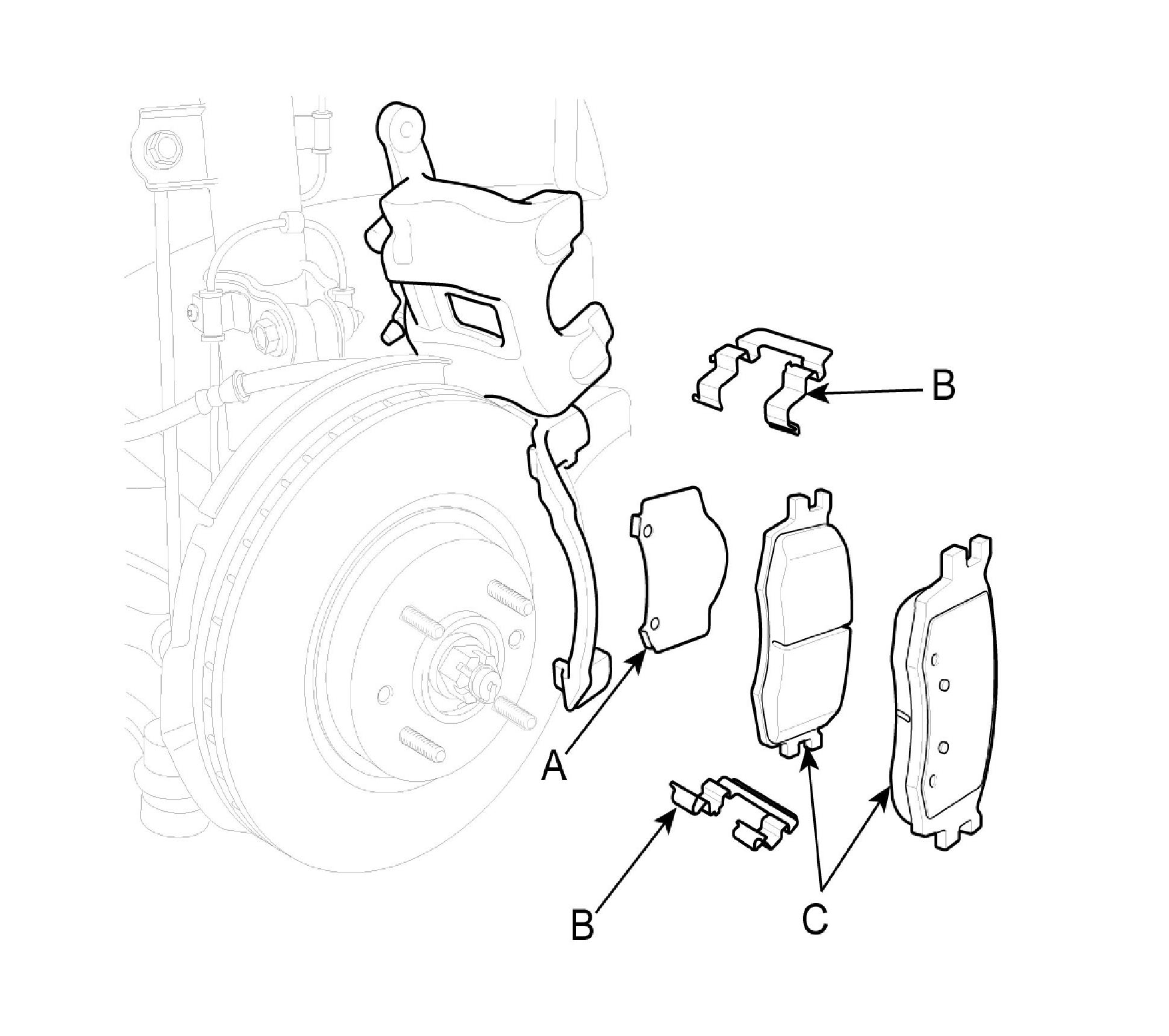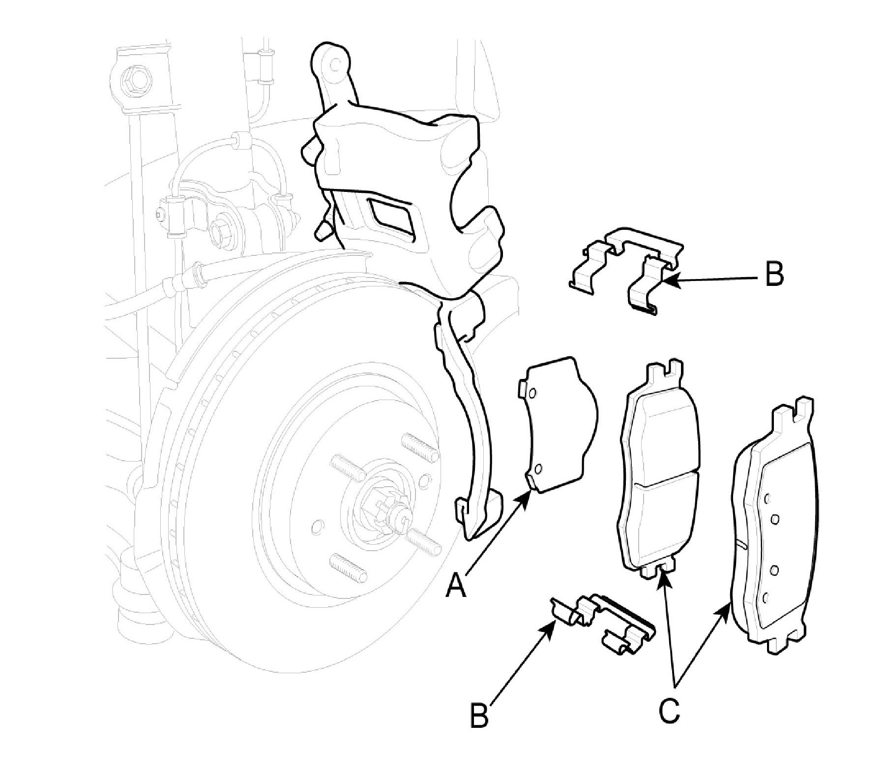 3. Install the brake pads (C) and pad shims (A) on the pad retainer correctly. Install the pad with the wear indicator on the inside. If you are reusing the pads, always reinstall the brake pads in their original positions to prevent a momentary loss of braking efficiency.
