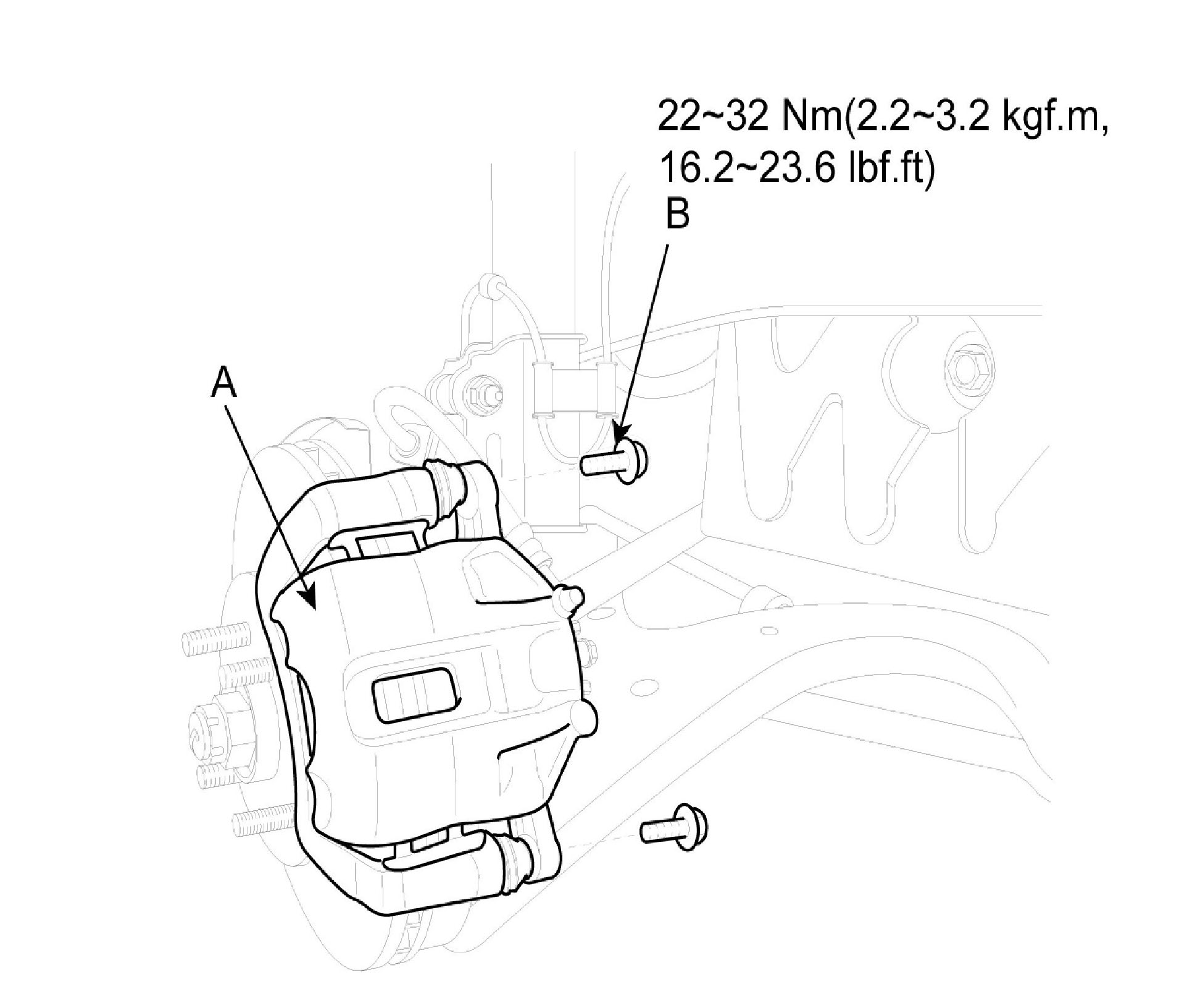 5. Pivot the caliper down into position. Being careful not to damage the pin boot, install the guide rod bolt (B) and tighten it to the specified torque.