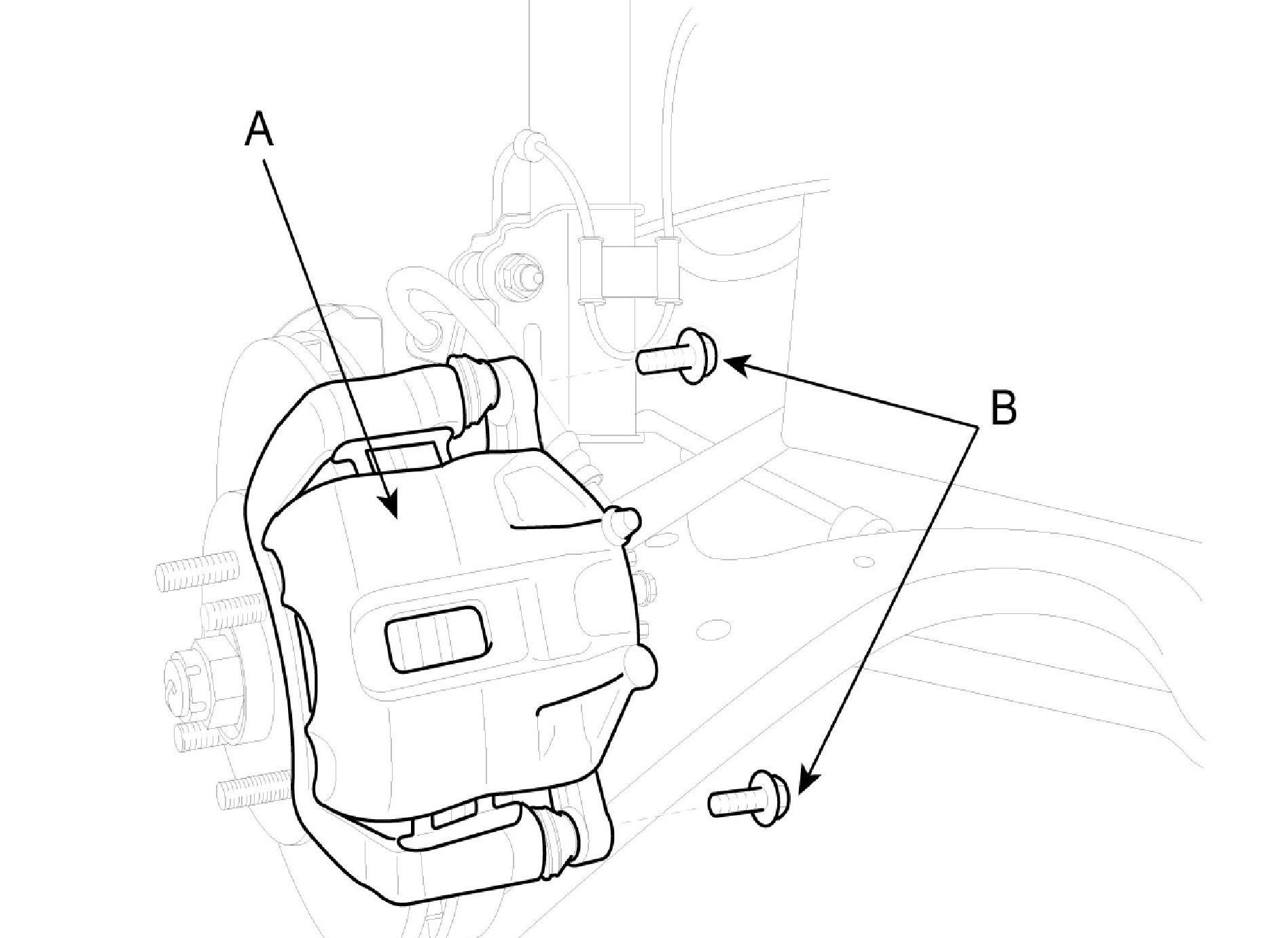 1. Remove guide rod bolt (B) and raise the caliper (A). Check the hoses and pin boots for damage and deterioration.