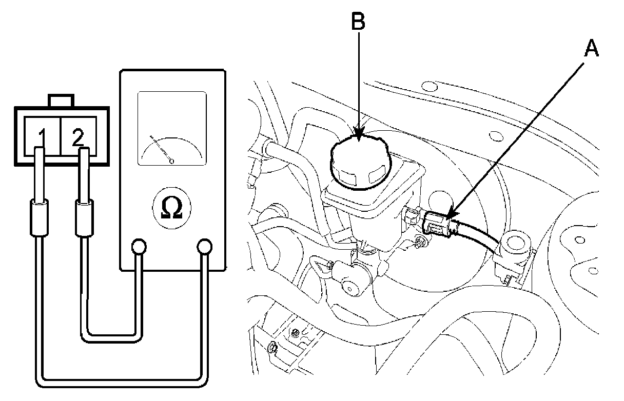 BRAKE FLUID LEVEL WARNING SWITCH.1. Remove the connector (A) from the switch located at the brake fluid reservoir (B).