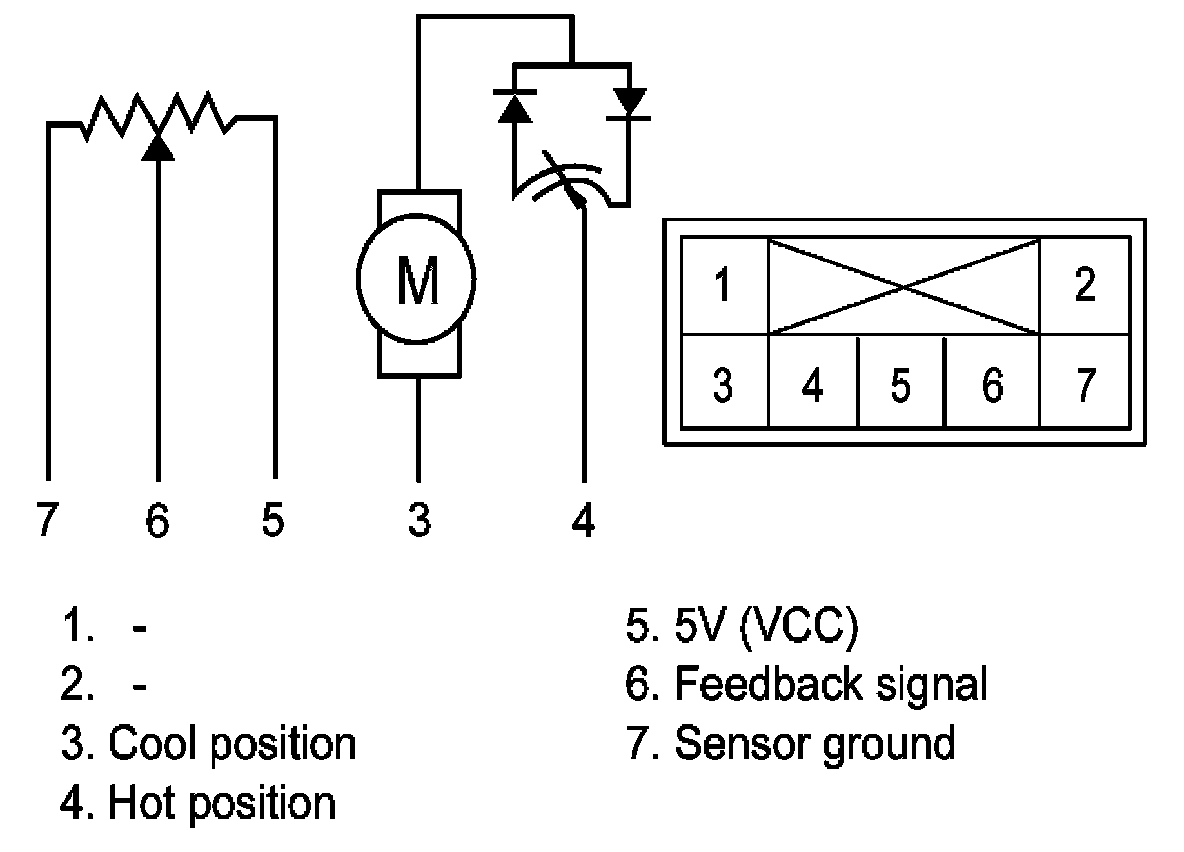3. Verify that the temperature control actuator operates to the hot position when connecting 12 V to the terminal 3 and grounding terminal 4. Verify that the temperature control actuator operates to the cool position when connecting in the reverse.