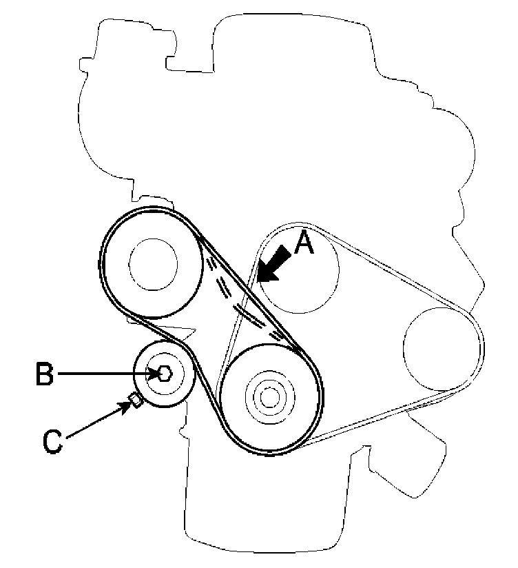 2. Apply a force of 98N (10 kgf, 22 lbf), and measure the deflection at the mid point (A) between the air condition compressor and crankshaft pulley.