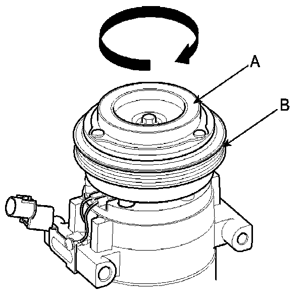 2. Check the pulley (B) bearing play and drag by rotating the pulley by hand. Replace the clutch set with a new one if it is noisy or has excessive play/drag.