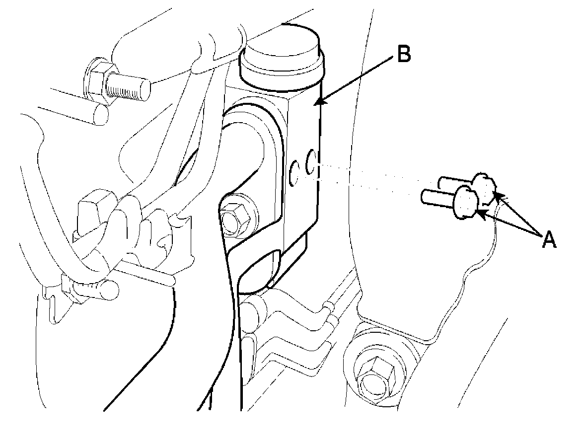 4. Remove the bolts (A) and the expansion valve (B) from the evaporator core. Plug or cap the lines immediately after disconnecting them to avoid moisture and dust contamination.