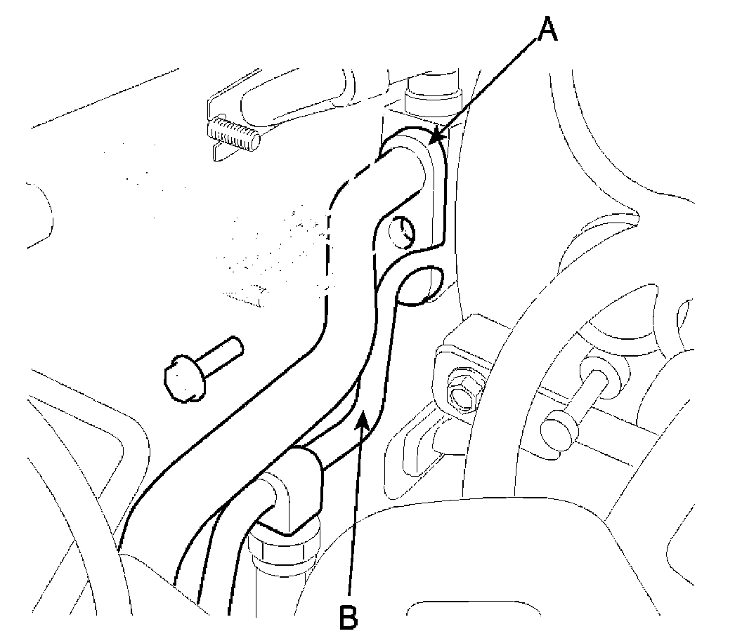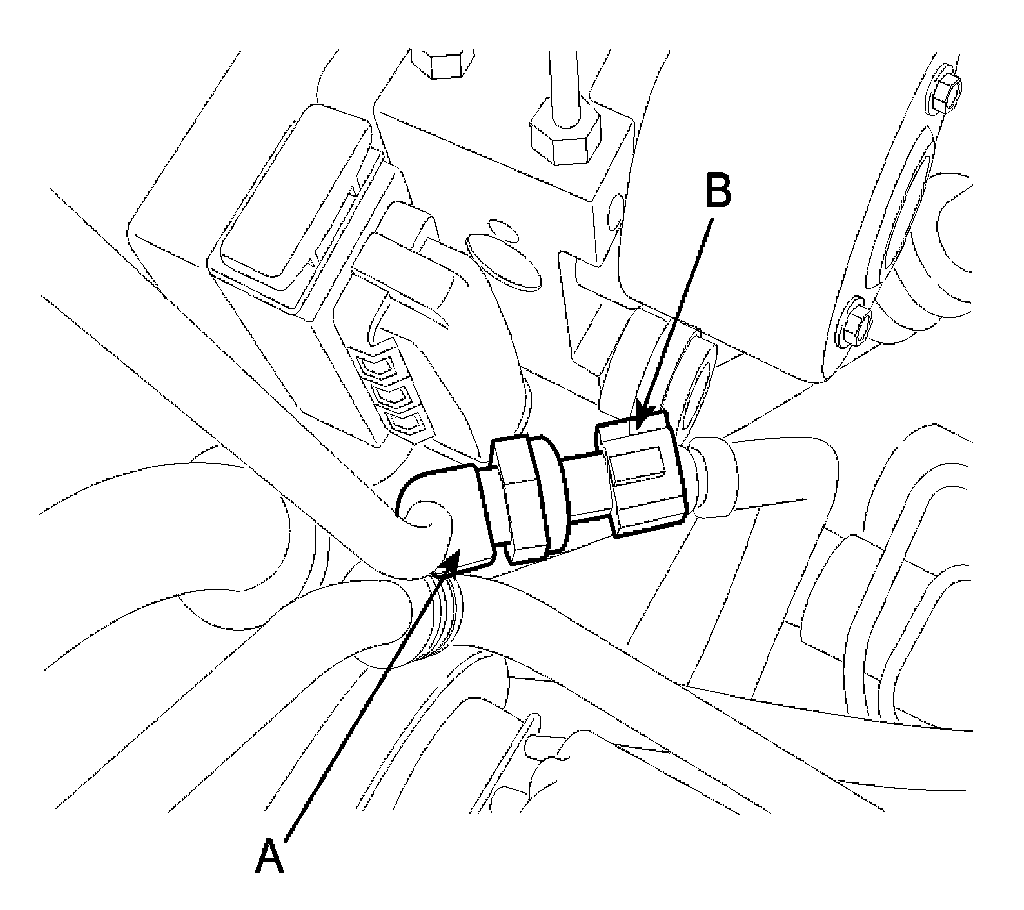 6. Remove the A/C pressure transducer (B) while holding on to the fitting block (A).