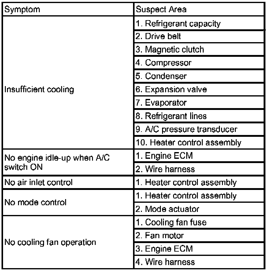 Before replacing or repairing air conditioning components, first determine if the malfunction is due to the refrigerant charge, air flow or compressor. Use the table to help you find the cause of the problem. The numbers indicate the priority of the likely cause of the problem. Check each part in order. If necessary, replace these parts. After correcting the malfunction, check the complete system to ensure that performance is satisfactory.
