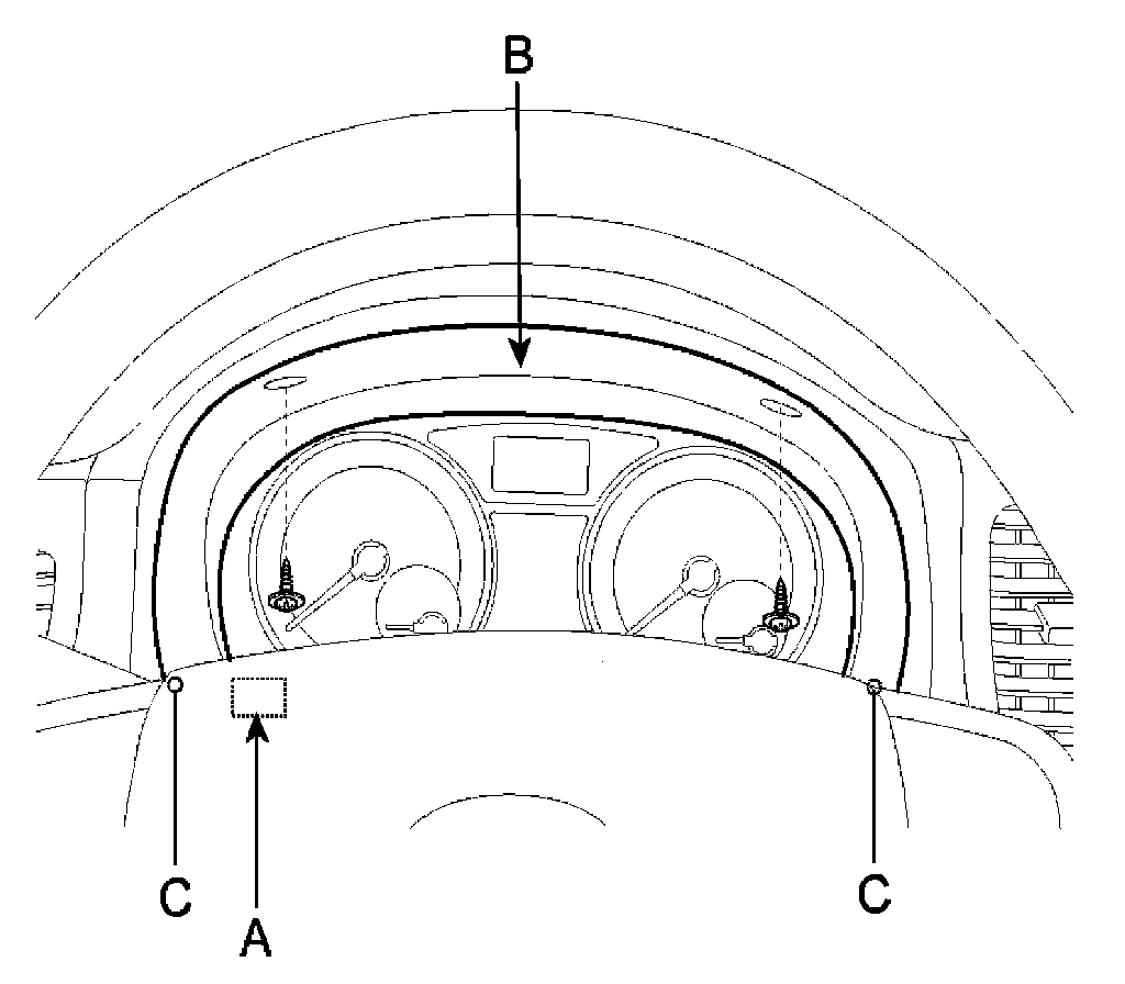 2. Remove the cluster facia panel (B) after disconnecting the connector of trip switch (A) and loosening the 2 screws take care of fixing clips (C).