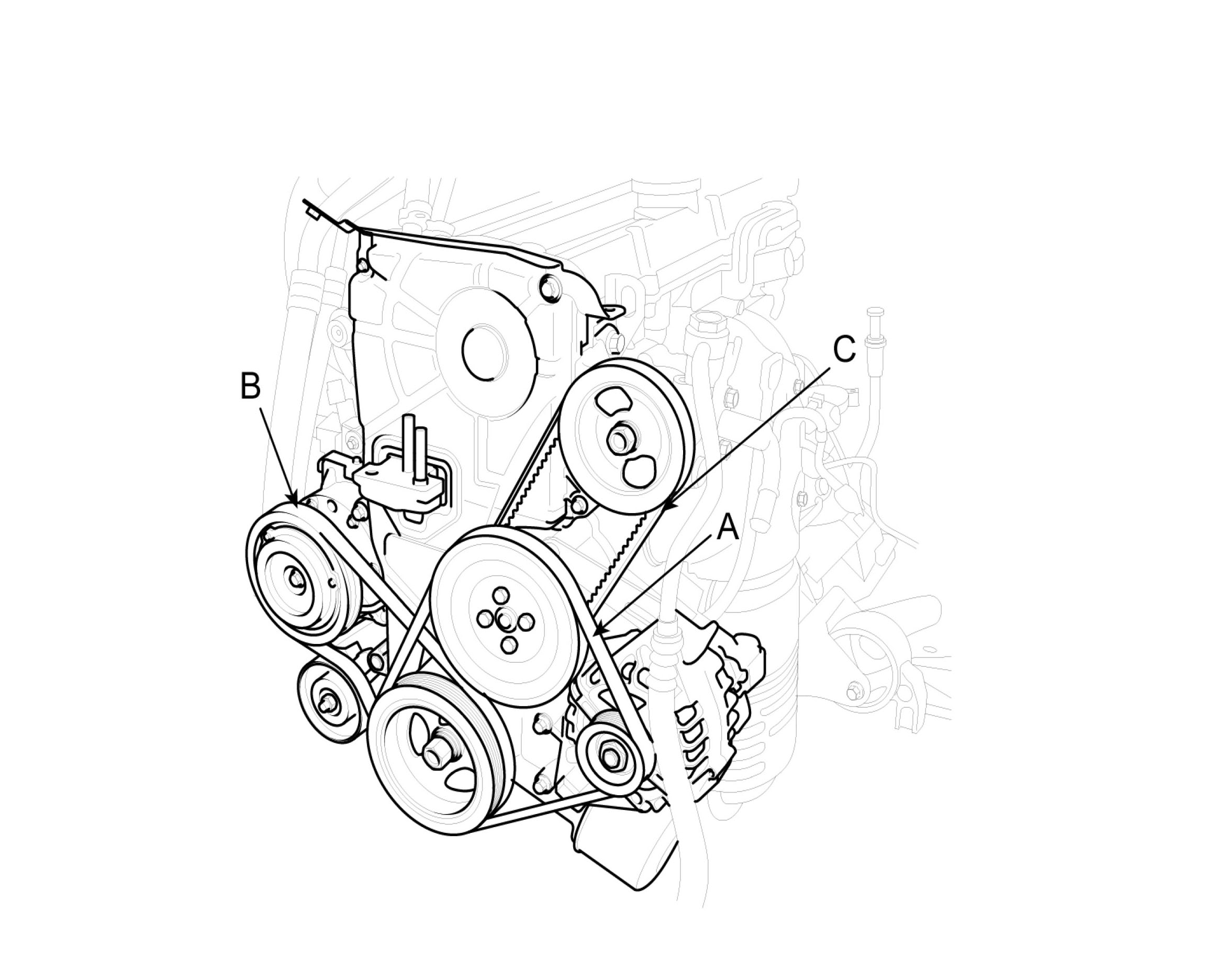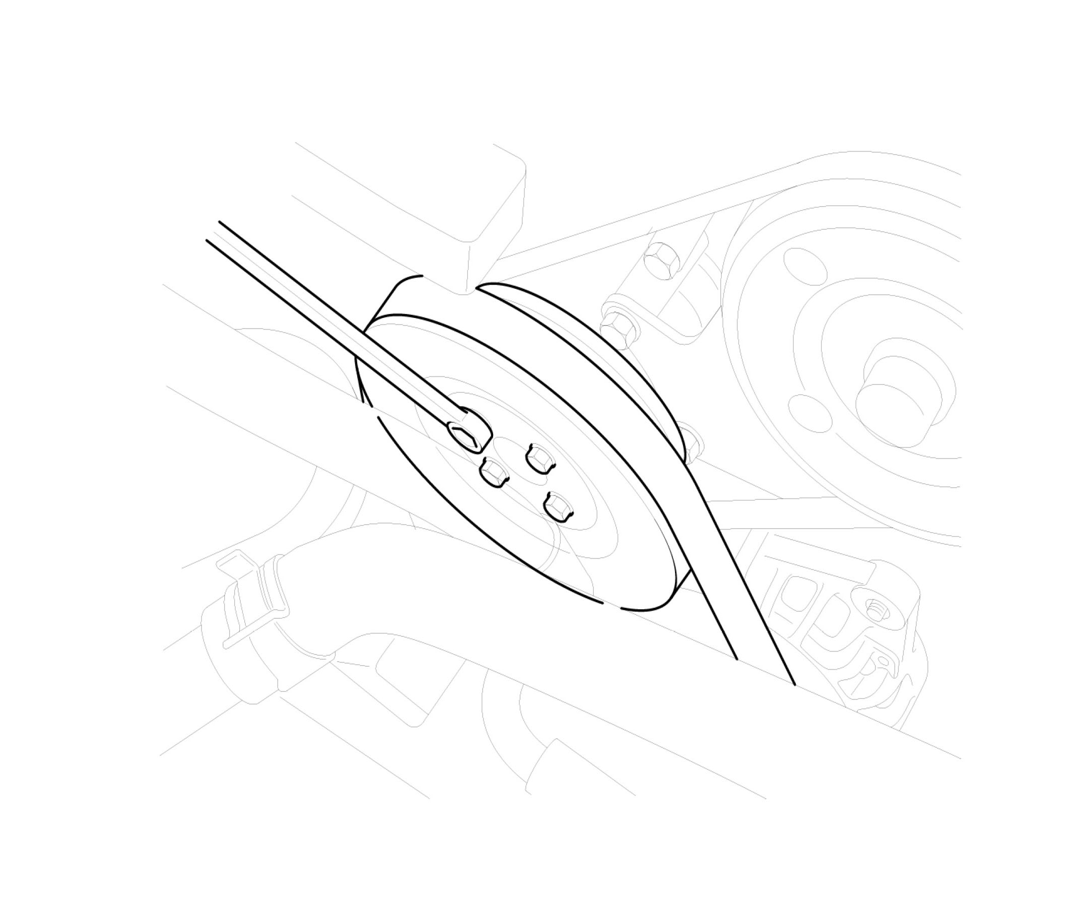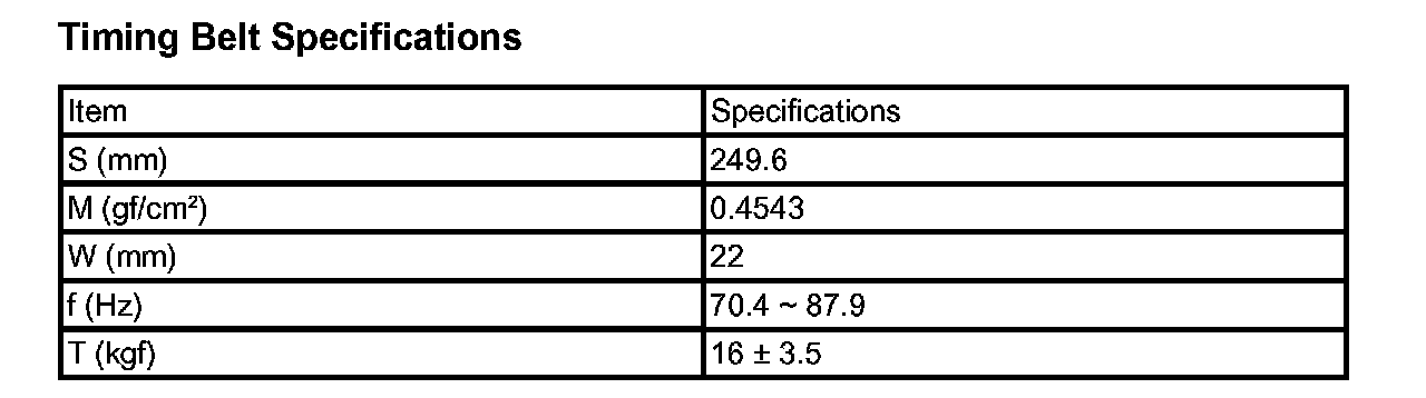 CAUTION: Avoid rotating the crankshaft in a counter clock wise direction. Engine damage could occur. Conversion equation of frequency into tension:T = (4 / 9.8) x S2 x M x W x f2 / 100000000S: Measured belt span (mm)M: Unit weight of belt (gf/cm2)W: Belt width (mm)f: Transverse natural frequency of belt (Hz)