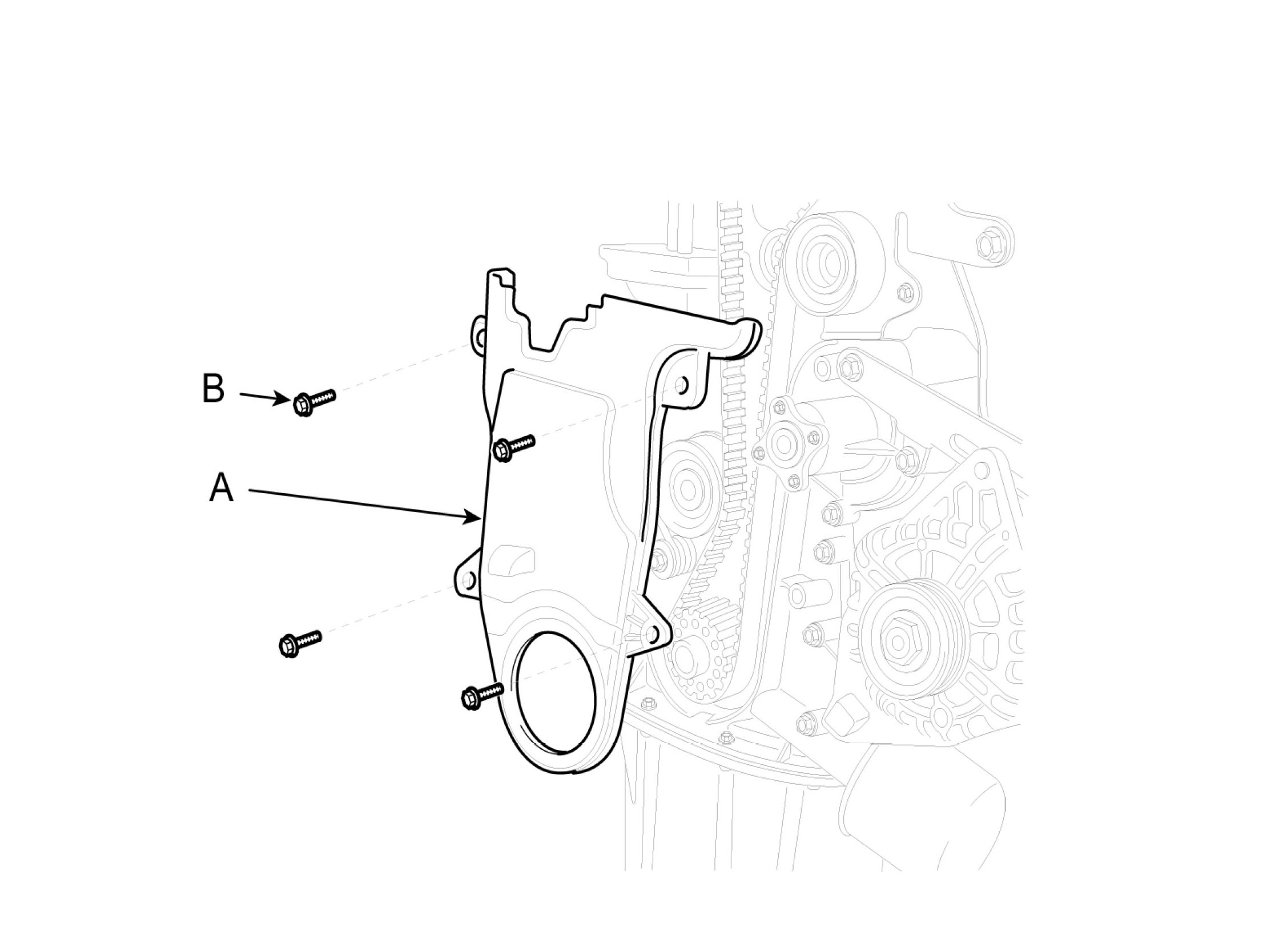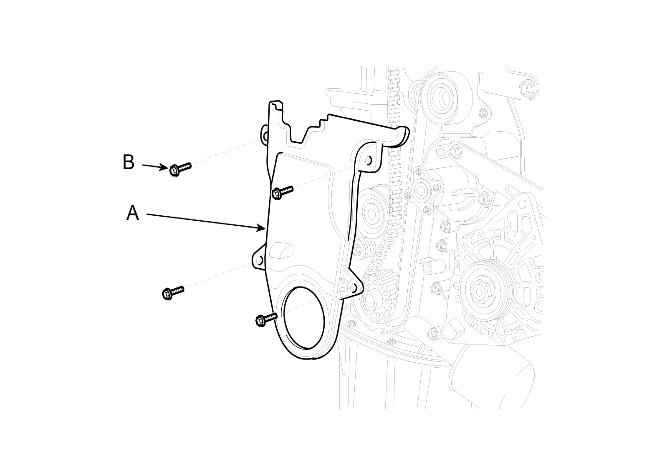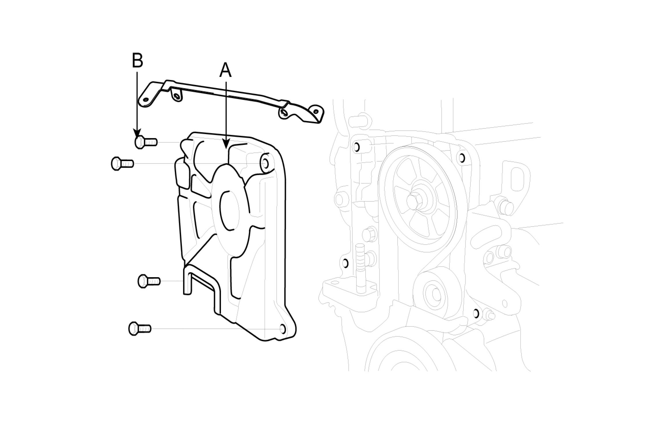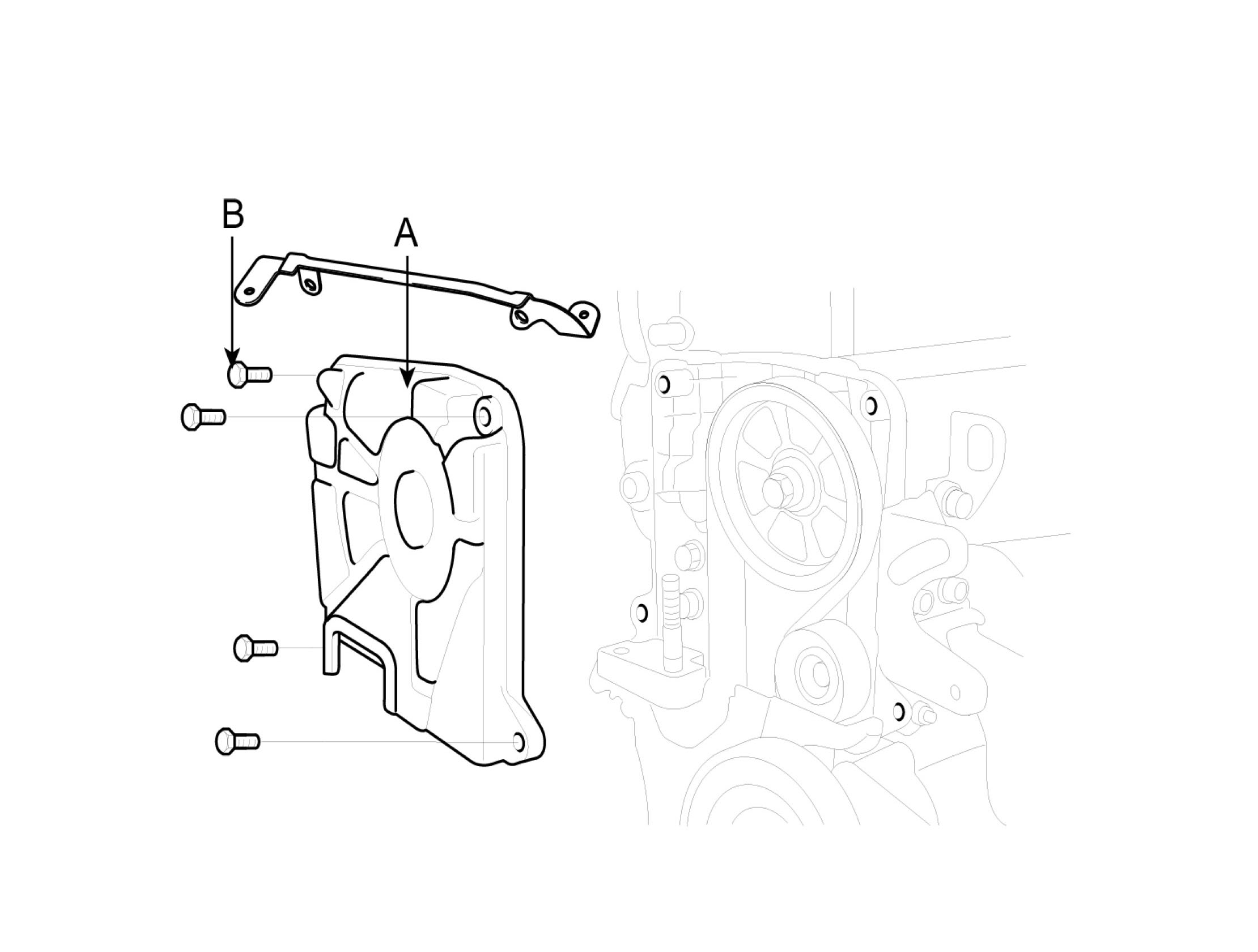 9. Remove the 4 bolts (B) and timing belt upper cover (A).