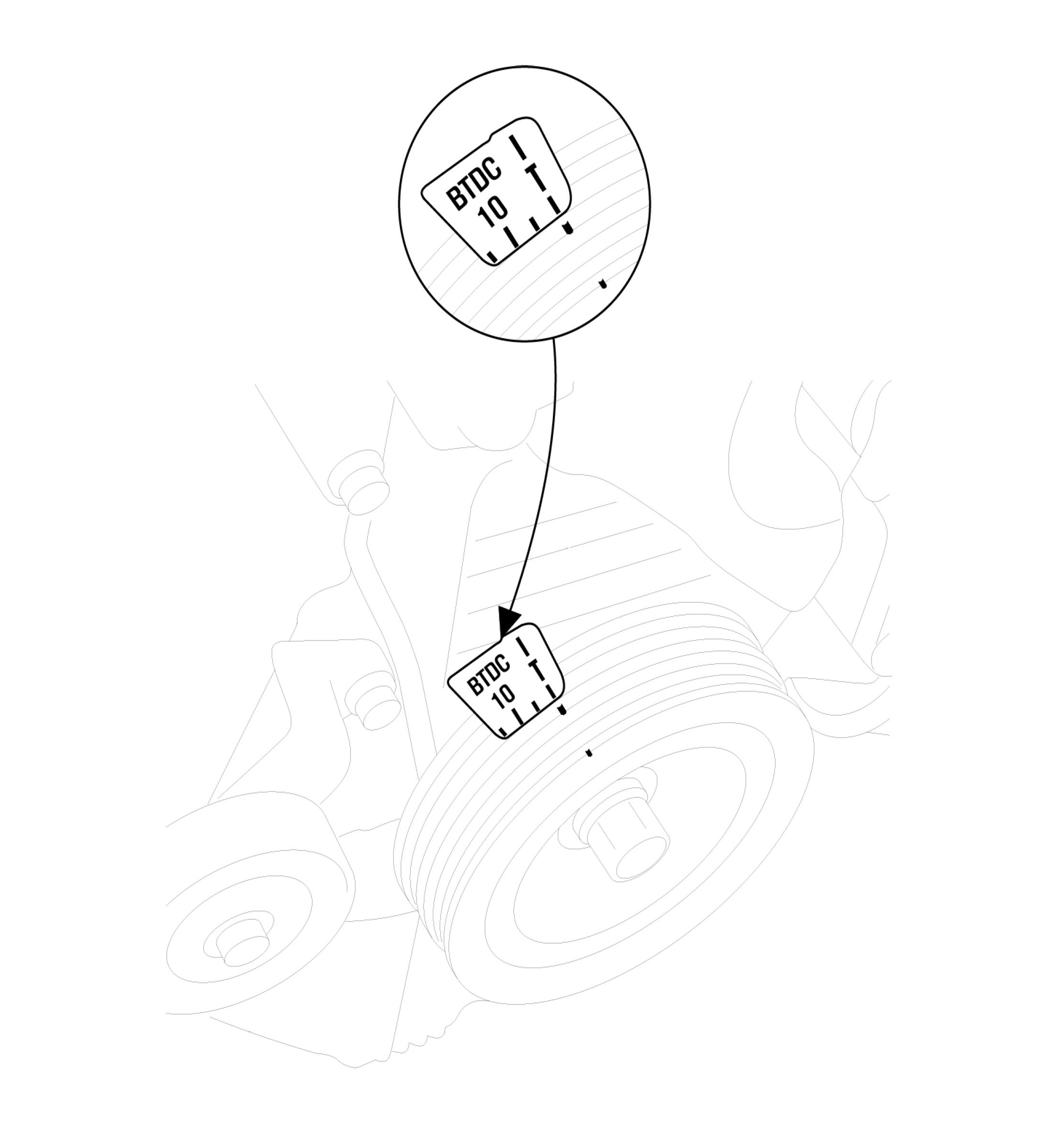 E. Timing belt tension measuring procedure (by a sonic tension gauge)Rotate crankshaft in clockwise direction to set 1st piston on top dead center (TDC) and rotate crankshaft in counterclockwise to 90° then measure the belt tension in the middle of tension side span (in arrow direction of above illustration) by free vibration method.