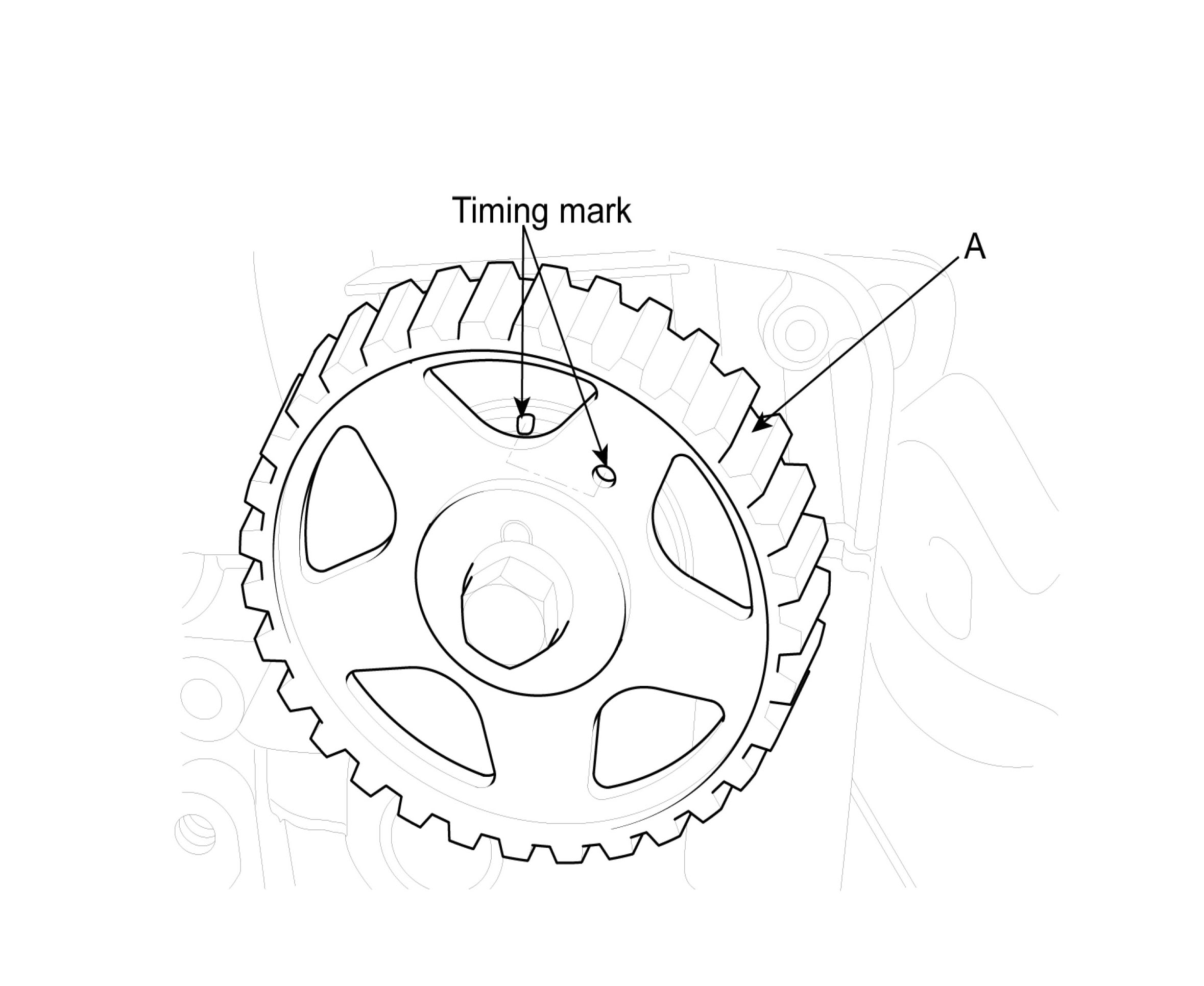10. Turn the crankshaft pulley, and align its groove with timing mark "T" of the timing belt cover. Check that the timing mark of camshaft sprocket (A) is aligned with the timing mark of cylinder head cover. (No.1 cylinder compression TDC position)