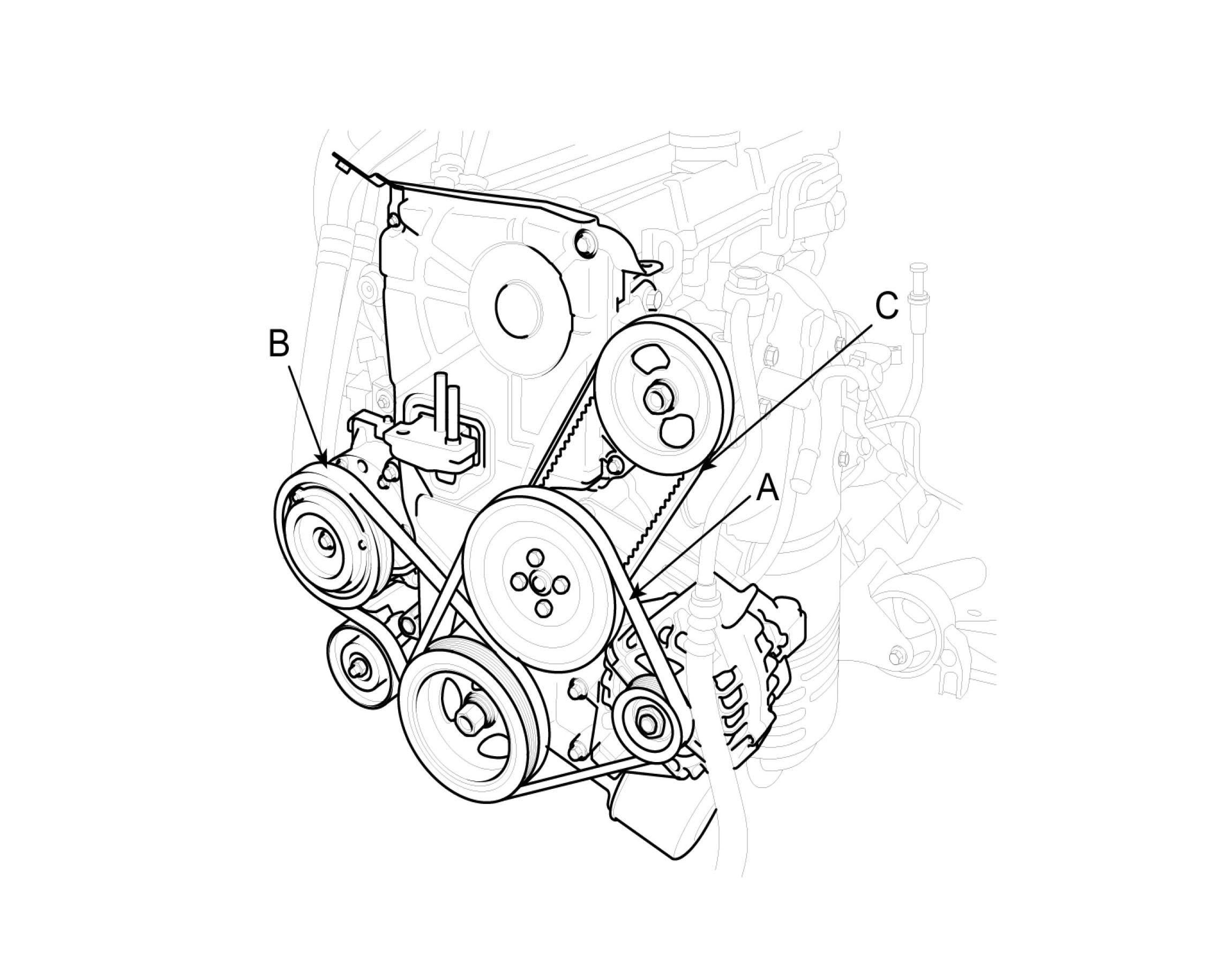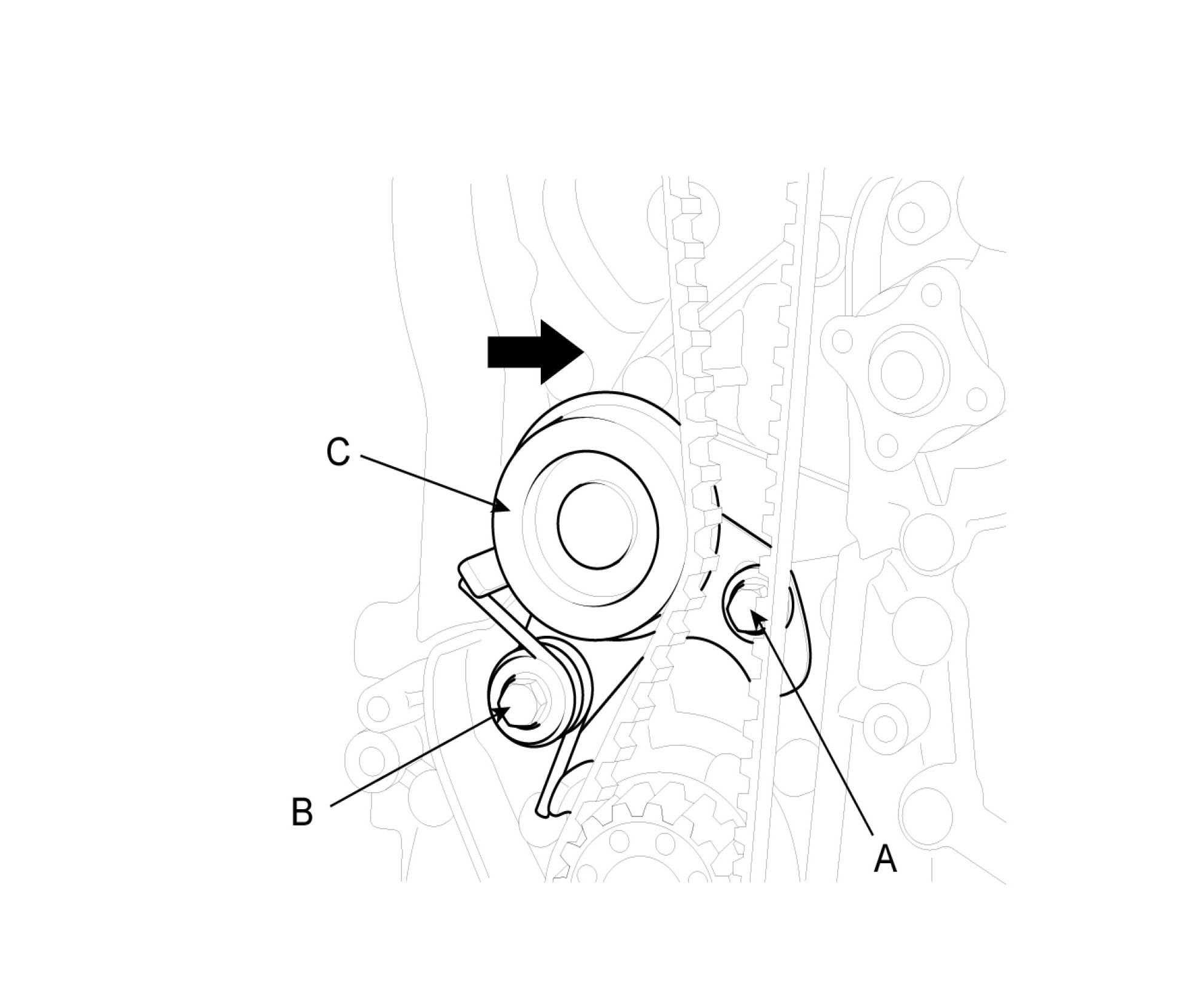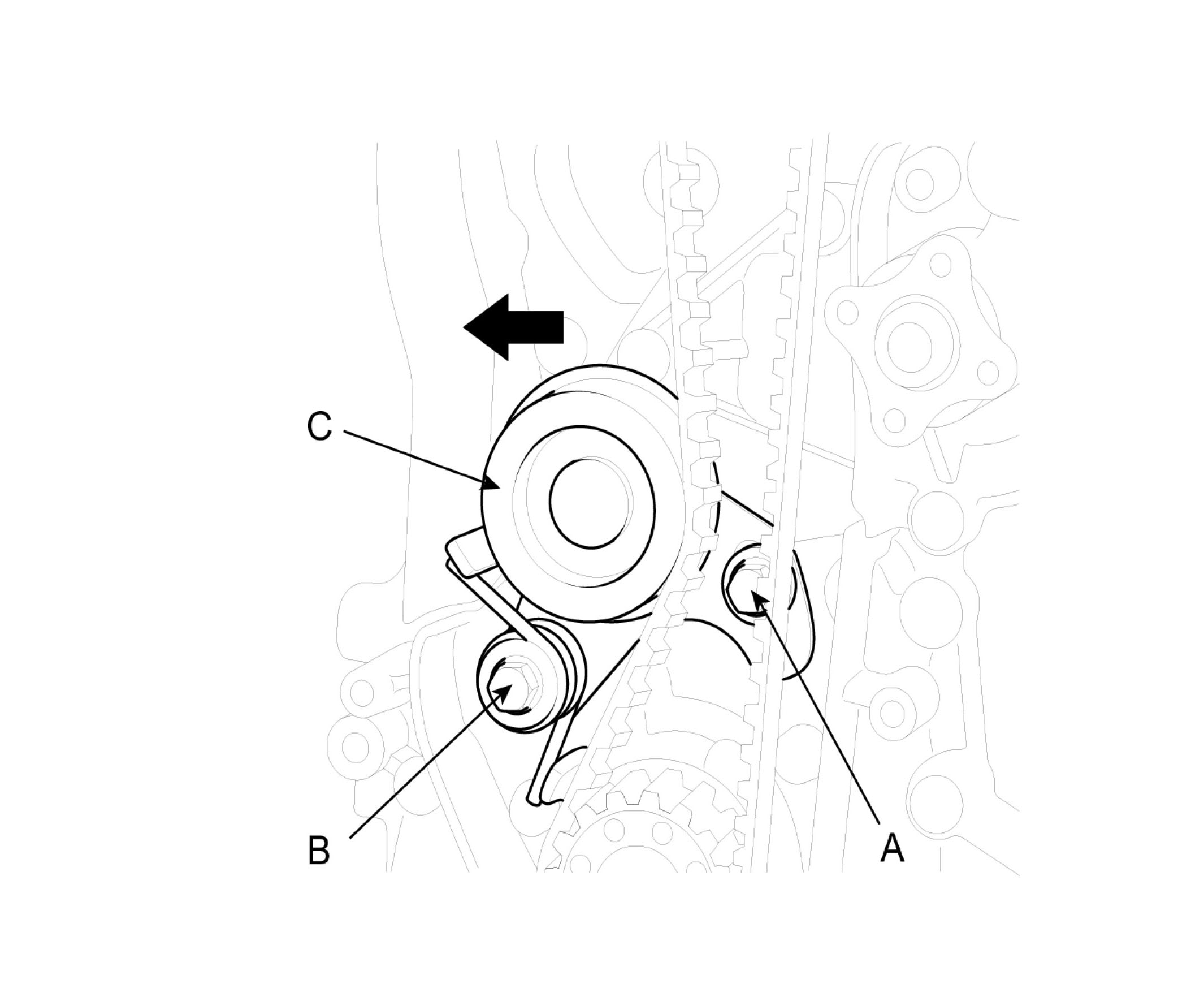 13. Move the tensioner pulley (C) in the direction of the arrow shown after loosen the mounting bolt (A, B). And temporarily tighten mounting bolt (A, B).