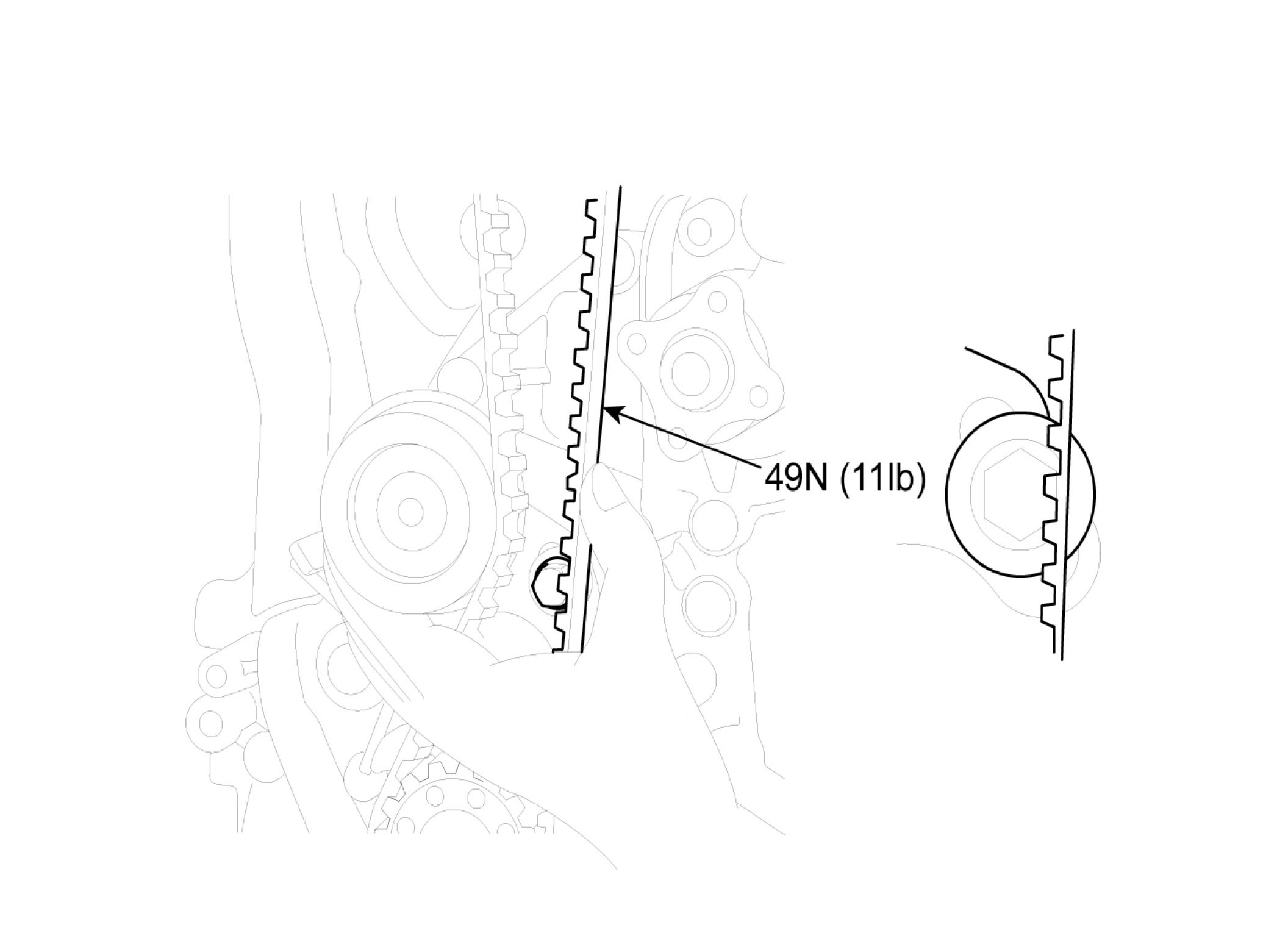 D. Then recheck the belt tension. Verify that when the tensioner and the tension side of the timing belt are pushed in horizontally with a moderate force [approximately 49N (11 1b)], the timing belt cog end is approximately 1/2 of the tensioner mounting bolt head radius (across flats) away from the bolt head center.