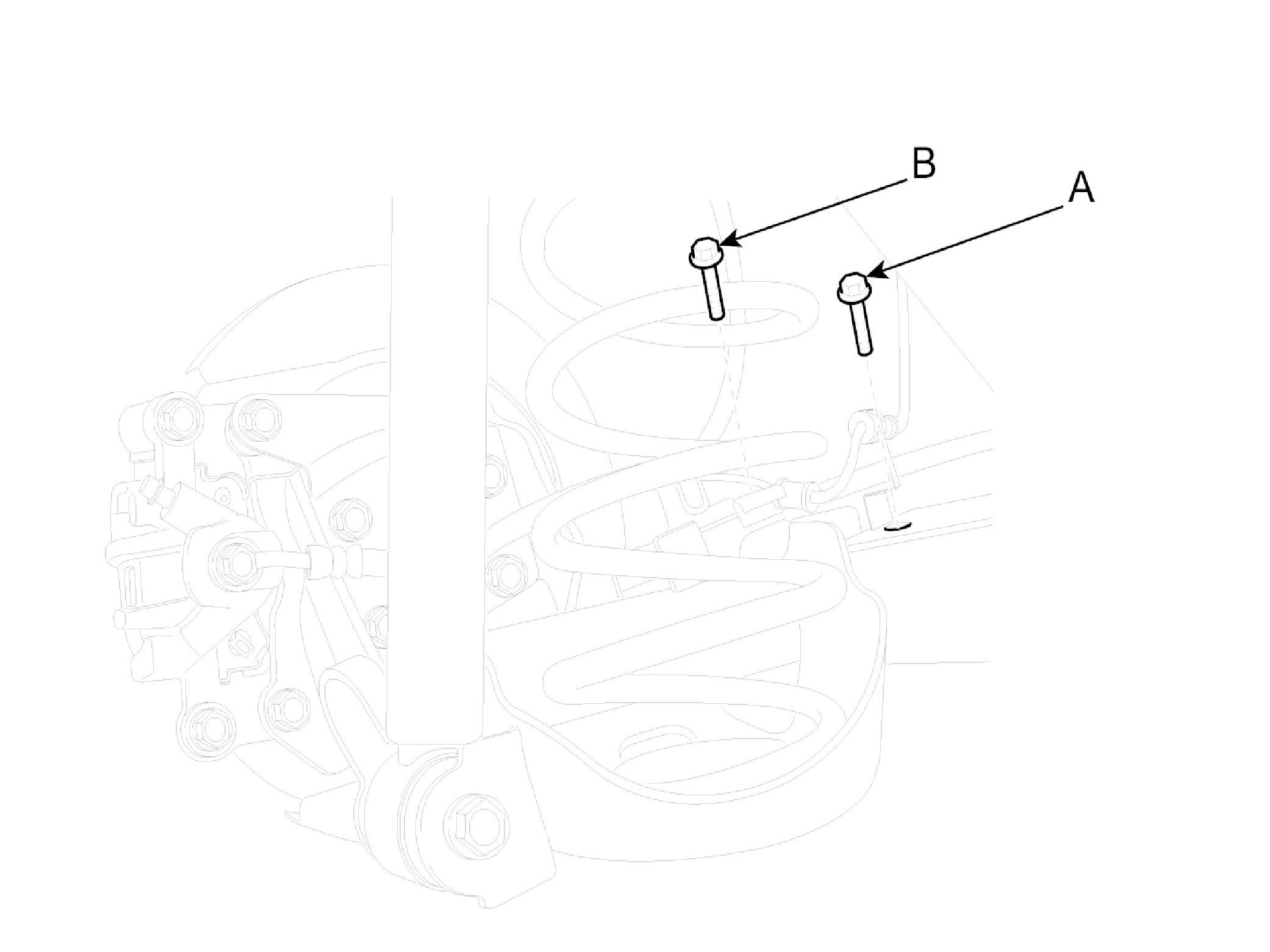 2. Remove the wheel speed sensor bracket bolt (A) and parking brake wire bracket bolt (B).