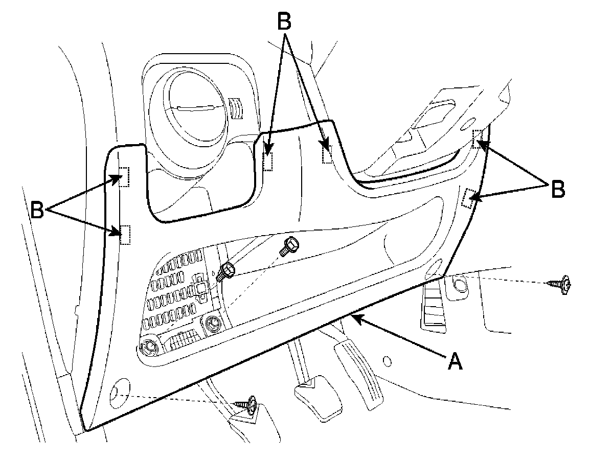 2. Remove the crash pad lower panel (A). Avoid damaging retaining clips (B).