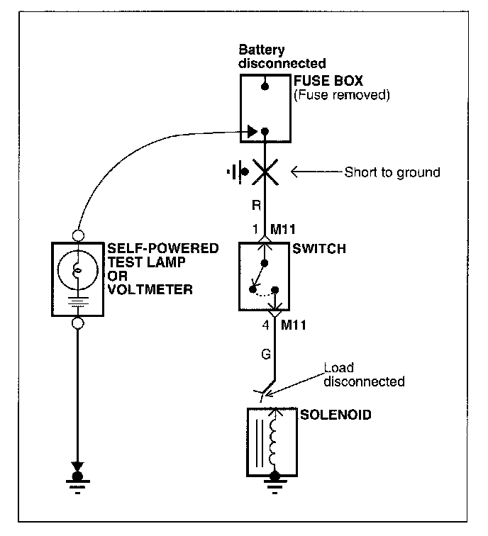 A. Connect one lead of a test lamp or voltmeter to a ground. If you are using a voltmeter, be sure it is the voltmeter's negative test lead you have connected to ground.