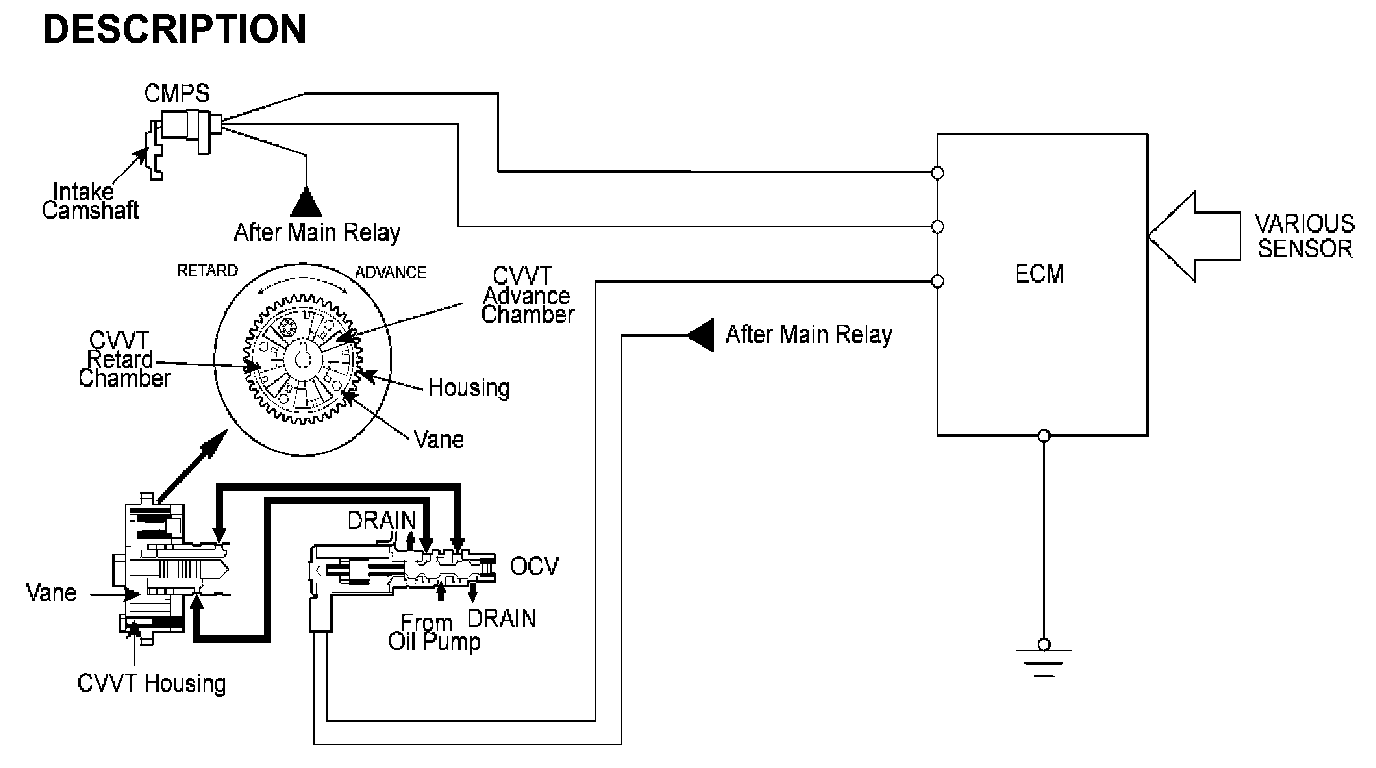 The CVVT (Continuously Variable Valve Timing) which is installed on the exhaust camshaft controls intake valve open and close timing in order to improve engine performance.The intake valve timing is optimized by the CVVT system depending on engine rpm.This CVVT system improves fuel efficiency and reduces NOx emissions at all levels of engine speed, vehicle speed, and engine load by EGR effect because of valve overlap optimization.The CVVT changes the phase of the intake camshaft via oil pressure. It changes the intake valve timing continuously.