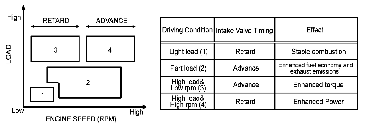 The CVVT system makes continuous intake valve timing changes based on operating conditions.Intake valve timing is optimized to allow the engine to produce maximum power.Cam angle is advanced to obtain the EGR effect and reduce pumping loss. The intake valve is closed quickly to reduce the entry of the air/fuel mixture into the intake port and improve the changing effect.Reduces the cam advance at idle, stabilizes combustion, and reduces engine speed.If a malfunction occurs, the CVVT system control is disabled and the valve timing is fixed at the fully retarded position.