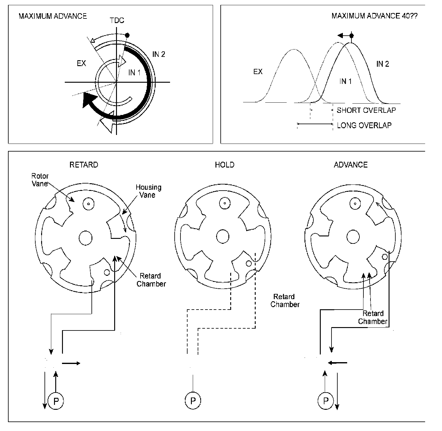 The OCV (Oil-flow Control Valve) spool location at this time is as follows. Oil pump -> Advance oil chamber (Little by little open the inflow side to the advance oil chamber) -> Almost close the drain side. Be sure there might be a difference in the position according to the engine running state (rpm, oil temperature, and oil pressure).