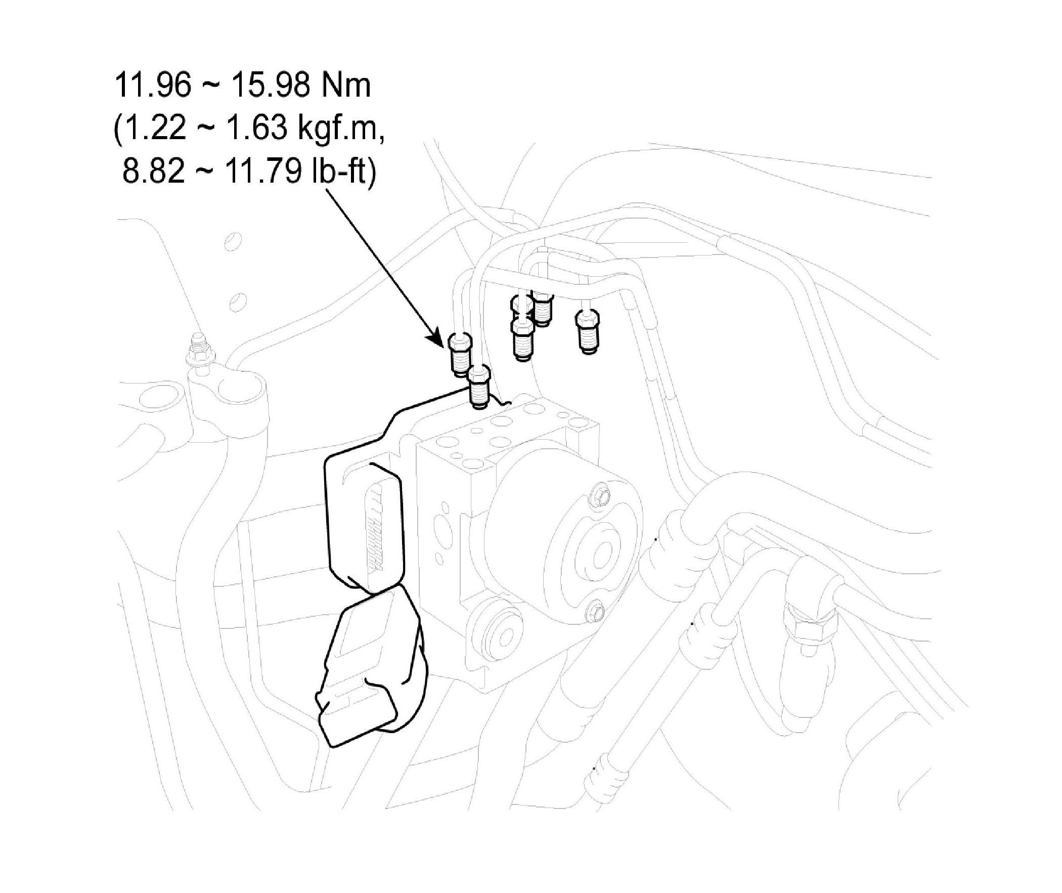 HECU bracket mounting bolt, nut: 7.85 - 9.8 Nm (0.8 - 1.0 kgf.m, 5.79 - 7.23 lb-ft)